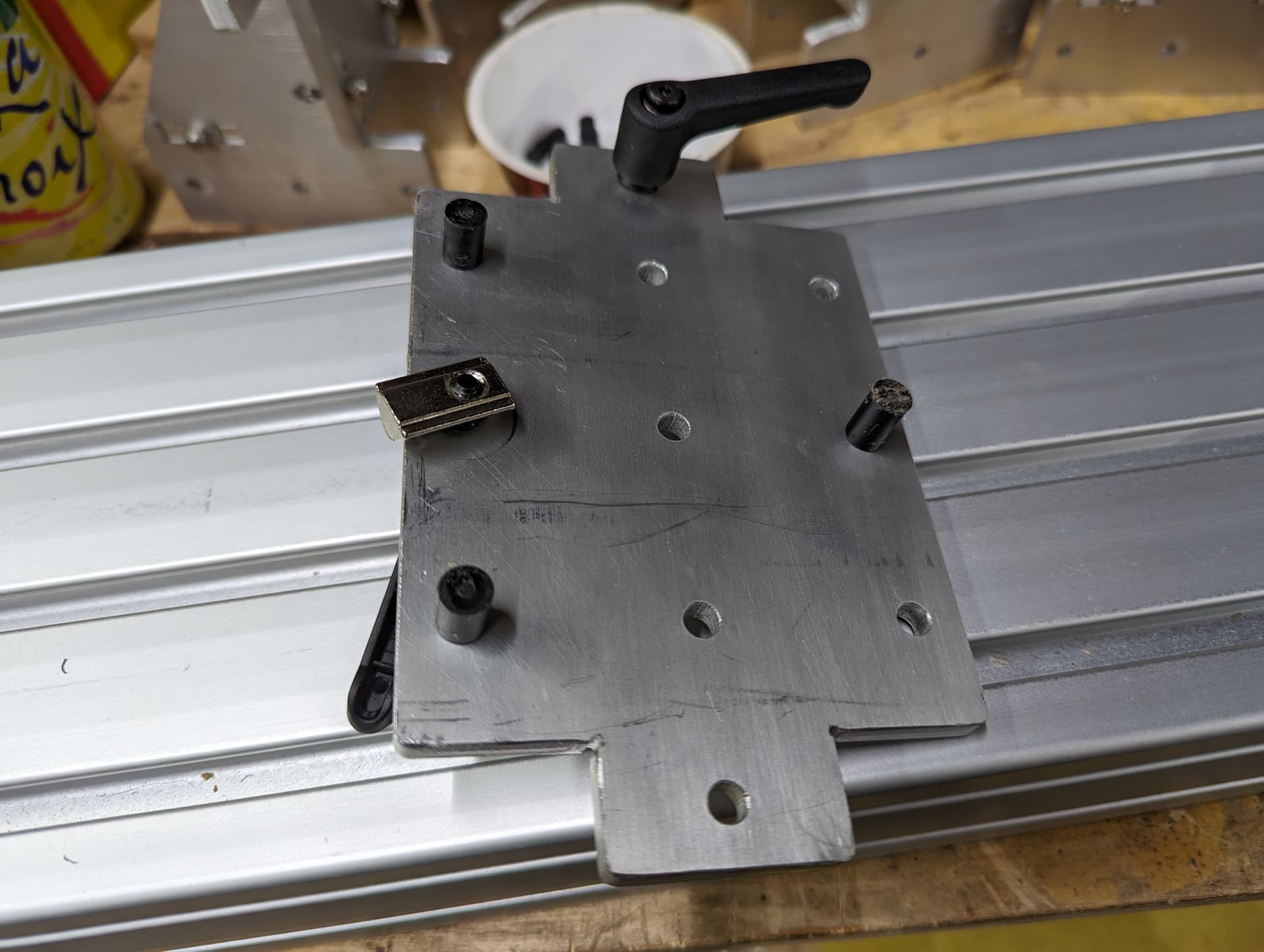 @Benjamin How conveniently, I just made some! I made some pins to locate the plates on the 8020 rail by turning them on my lathe to the dimensions of the 8020 rail gap and the 6mm hole in the plates for the Open Source Bike Fixture.