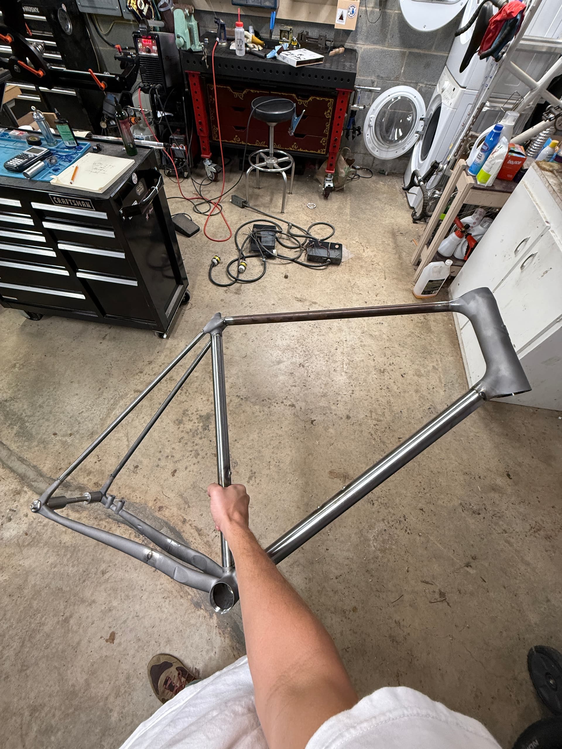 After welding, I used a band file to grind everything flush. Had plenty of access around all my joints, which certainly isn’t hurt by the fact that the frame is so huge :). definitely need to be careful at this step as it’s easy to forget how thin the tube walls are outside the welds, and how quickly you can make a big mistake! I have a super undersized compressor for this kind of tool, so was running way under the proper pressure for most of it. I left to get a drink of water which let the compressor pump up to full beans, and i proceeded (without thinking) to go at it with the same vigor as before, and filed a hole in a tube, which i then had to go back and patch. Mostly though, it was a great experience and I think this type of bike frame construction really helps those of us who suck at welding have simpler paths to trace while skills improve.