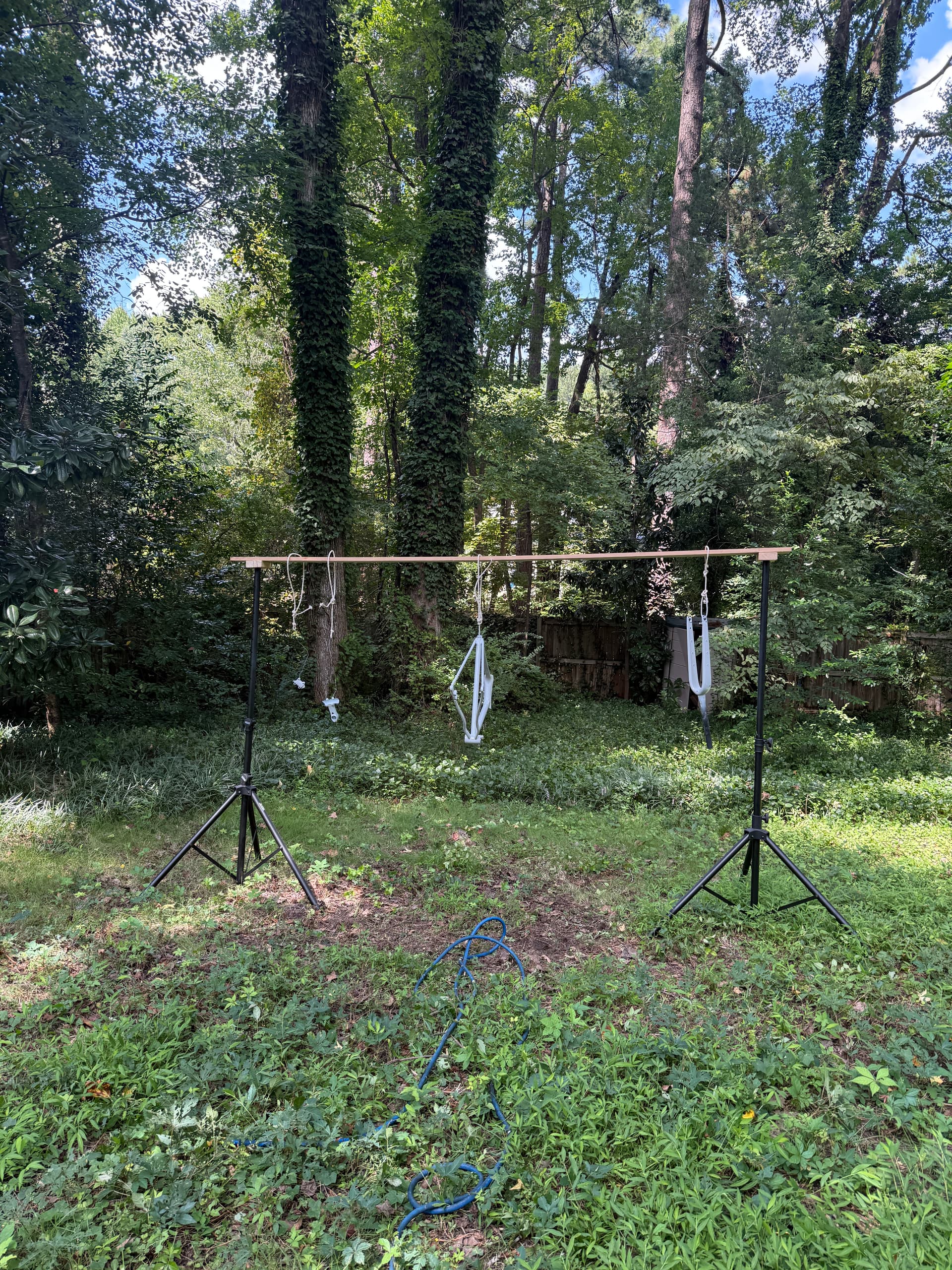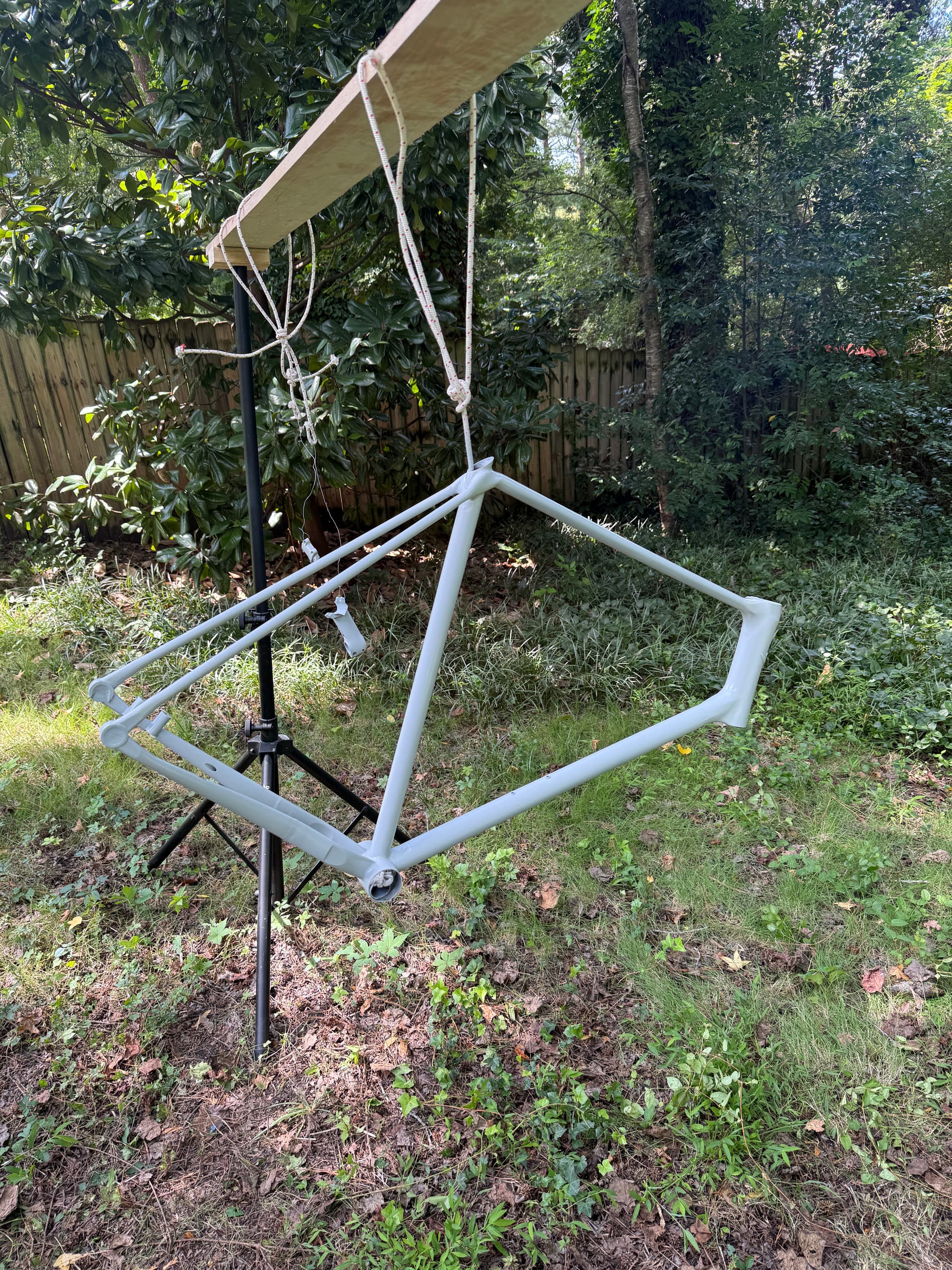 Painting is a bear in and of itself. This is my first bike but i’ve been a tinkerer all my life, so have done my fair share of urethane painting. That said, my current workshop setup is very un-conducive to spraying, so just made the best of what I have. I’m using Urechem paint products, which you can easily by cheaply online and shipped to your door without the hassle of the local paint shops which seem to hate shadetree guys like myself coming by and bugging them. I set up what I like to refer to as the most expensive windchime in history in the backyard with all the parts for the build and went to town. No real issues with the setup other than you just have to accept that it’s never going to be perfect working outside like this, and by the time i was putting clear on, the sun had mostly set, which is worst case for getting a good sheen. C’est la vie.