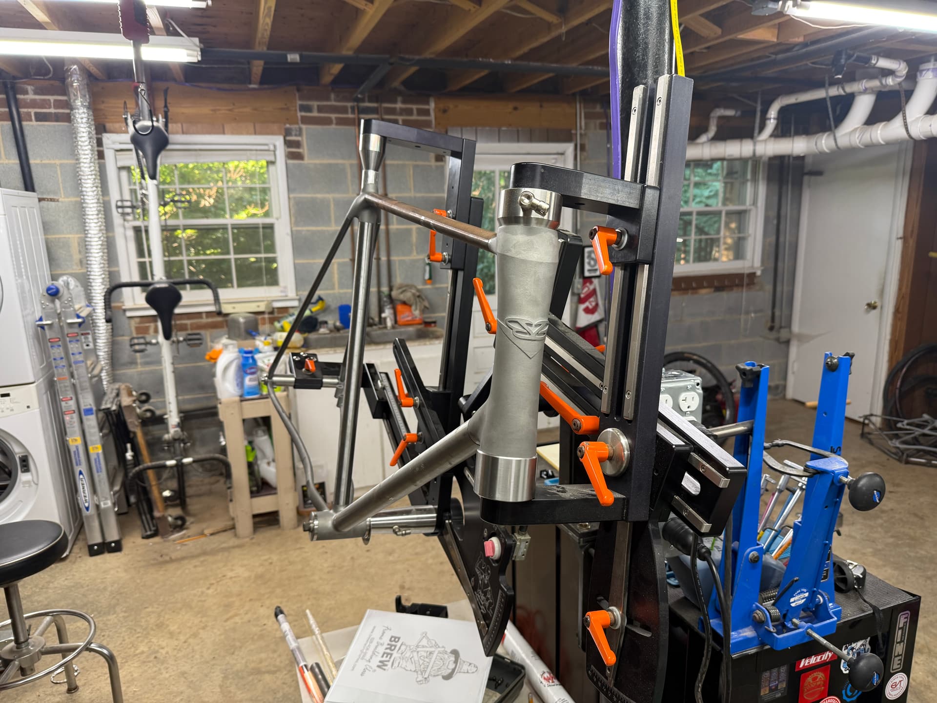 After welding the bike up, I did a rough check of alignment, where i found it’s mostly fine, but definitely induced some skew at the BB area. I realized I had fit up the BB shell in my jig at a slight angle by using the wrong spacer! At this point, knowing it’s my first frame, I decided to just charge ahead and accept that it might be a bit wonky.