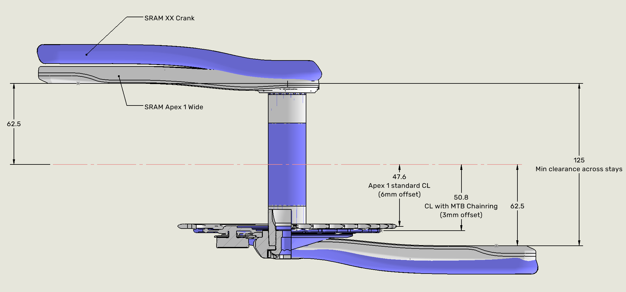 I was wondering I might be able to use a +0mm offset chainring from the MTB groupsets on the XPLR threaded power meter crankset instead of the +6.5mm chainring it uses by default. This would do two things: (1) bring the chainline out to 53.5mm (much closer to 148mm boost’s intended chainline) and (2) give an extra 6.5mm to squeeze in a driveside chainstay.