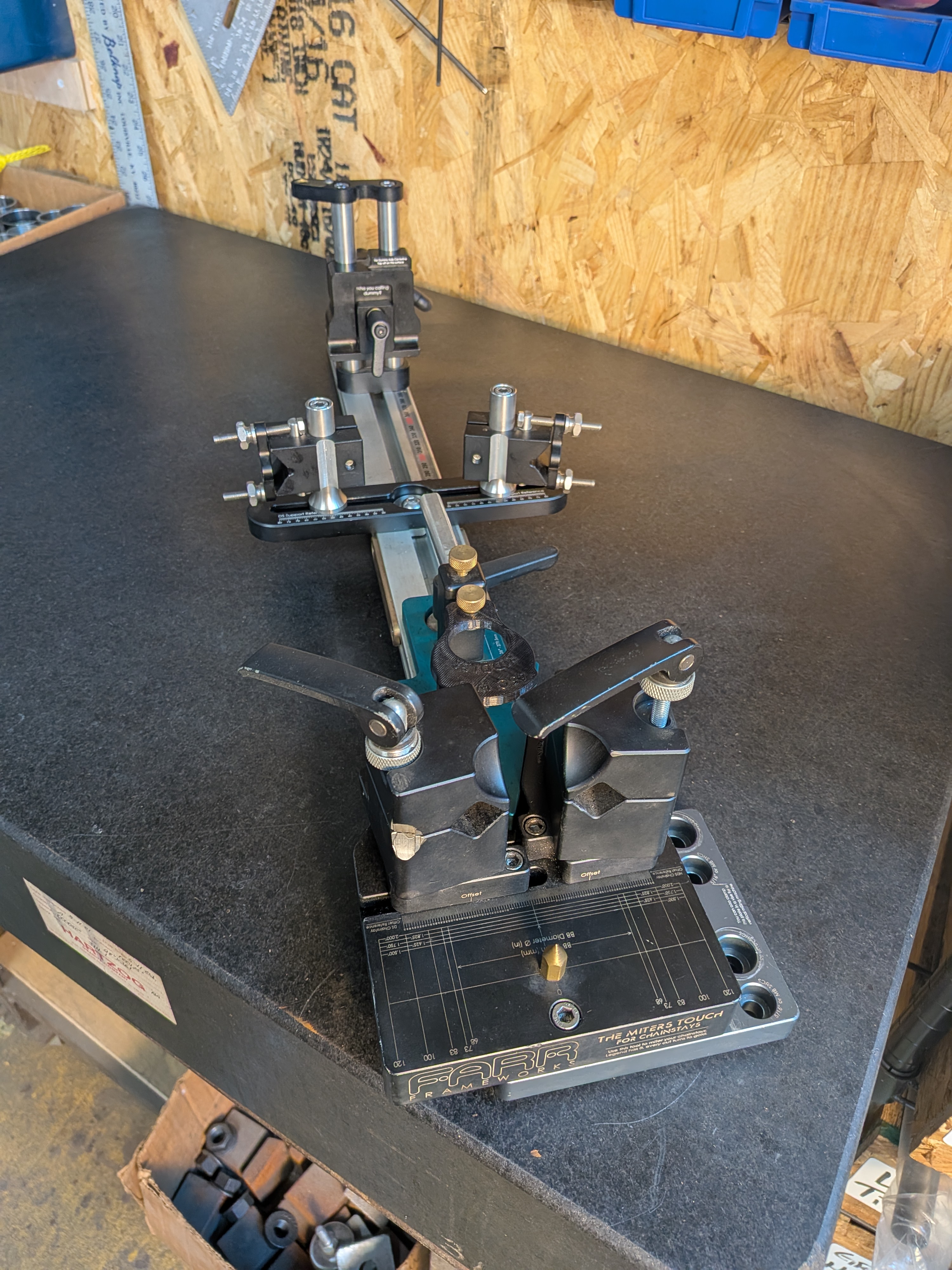 Farr Frameworks Miter’s Touch 700$ includes extra front towers (The installed ones have cutouts for seat stay/seat tube miter), additional base plate so the tool bottoms out in a vise. Variety of 3d printed tire dummys.