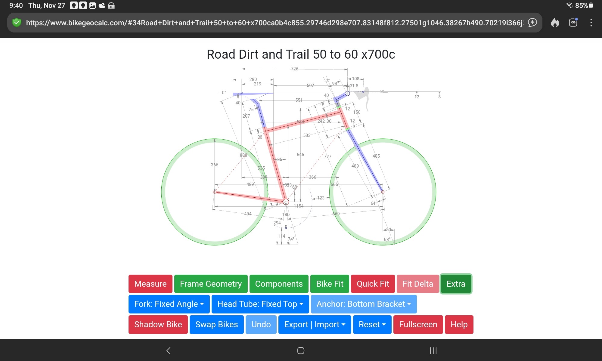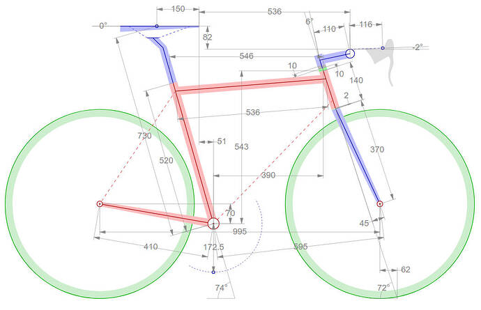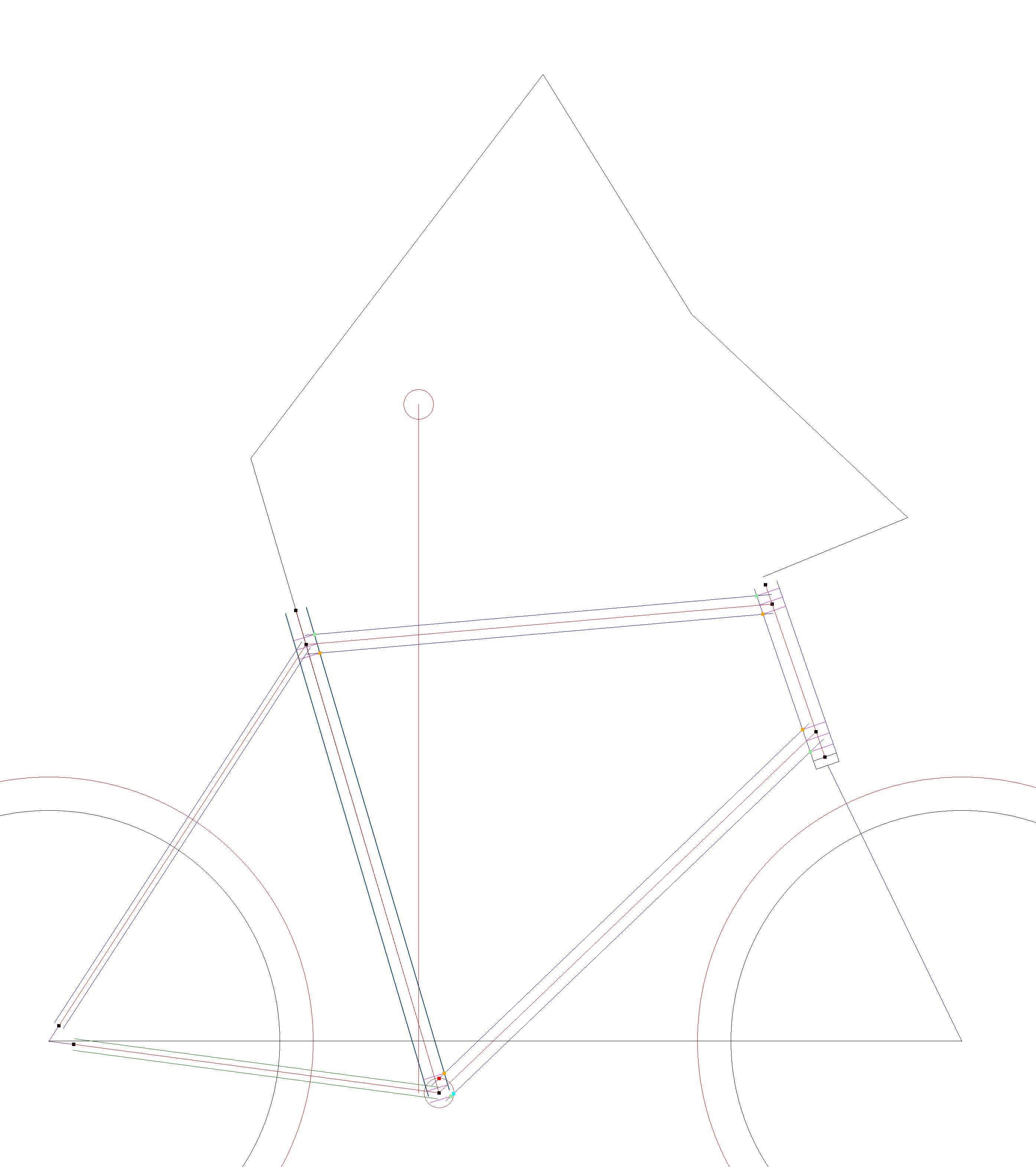 I’m currently in the process of designing my first frame. For sketching out my geometry, I used guy153’s CAD, and implemented a visualization for the center of gravity (red circle in the sketch below). The frame should build into a light touring/gravelish bike. Not for racing, not for expeditions. More like a bike for weekend trips with 50/50 gravel/paved.
