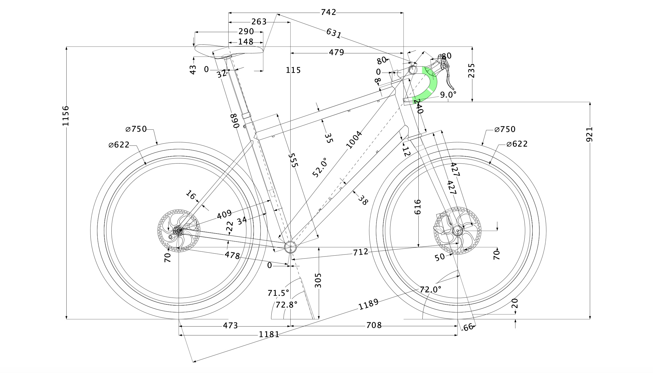 (The sketched bike has 685mm stack, 440mm reach, 69mm trail, 74°STA, 71°HTA, 610mm eff. top tube length, 70mm bb drop)