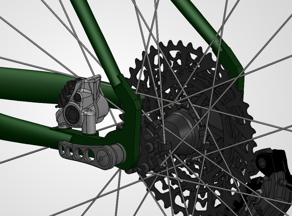 Design-intent was to try and keep the dropouts simple and a ‘one piece’ design. I also like the idea of the dropouts controlling the angle and attachment for the seat stays and chain stays, and maintaining the location for the brake mounts relative to the axle.