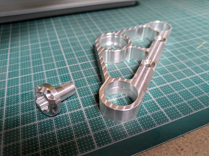 The shock mount needs some work, and the rear triangle needs routing for the brake hose. Other than that I am pretty much done. Simulation showed that I needed to beef up the rocker link. It’s substantially more solid now and visually looks still very light. gained a couple grams, but still very light and remained easy to machine.