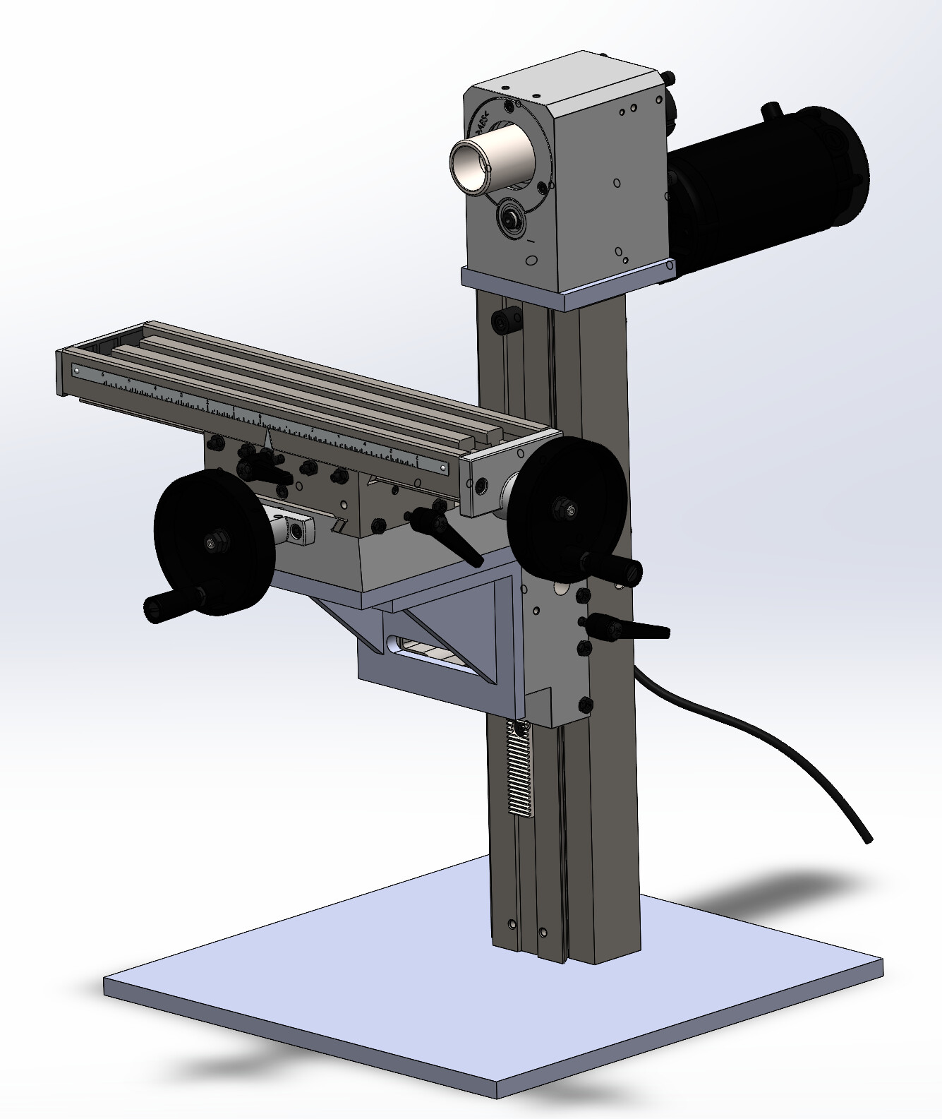 I found a model for the Sieg mini mills on GrabCAD and rearranged the parts. With 2 or 3 plates and a 90 angle block, one could recreate that tiny horizontal pretty easily it looks like.