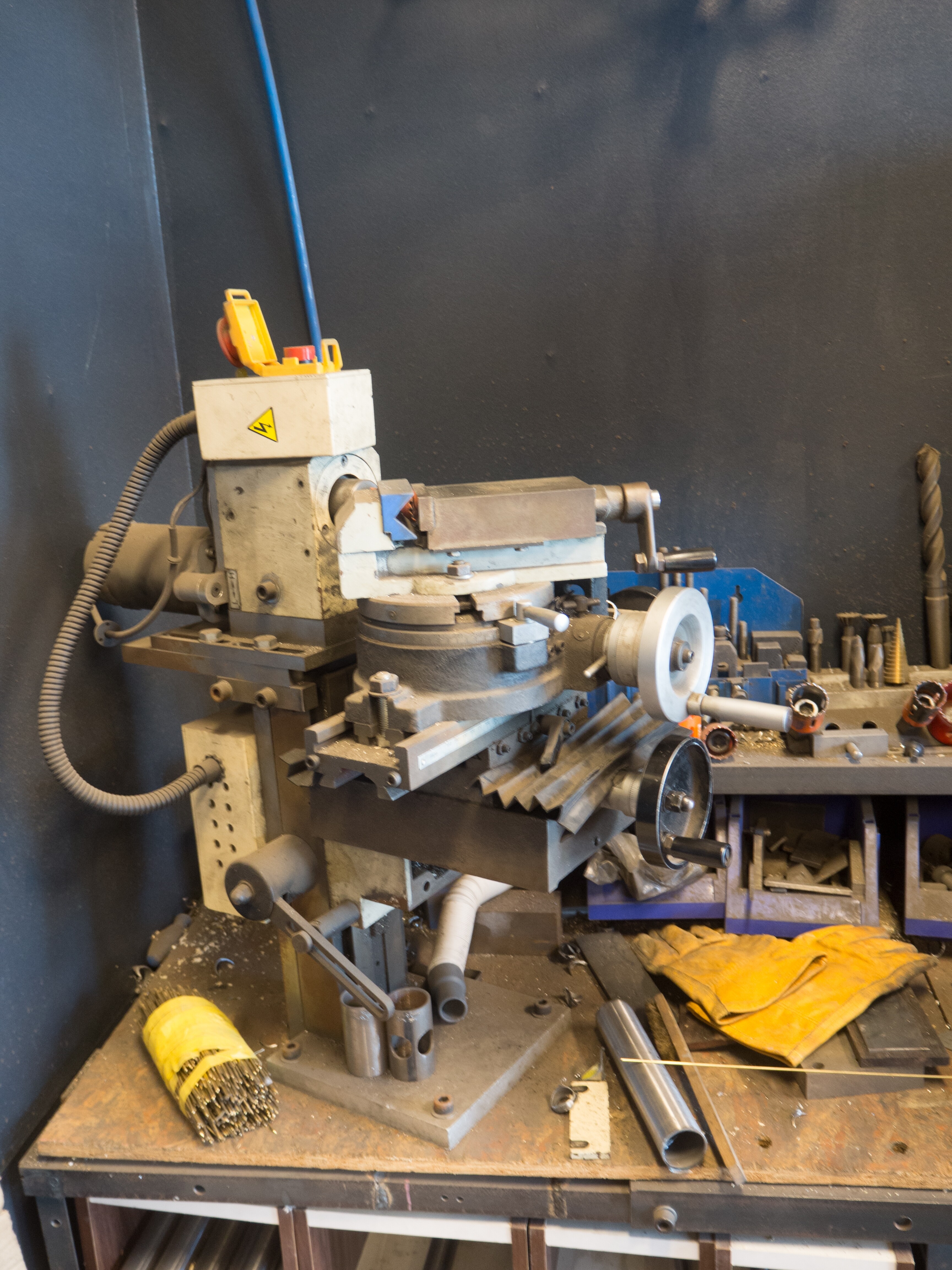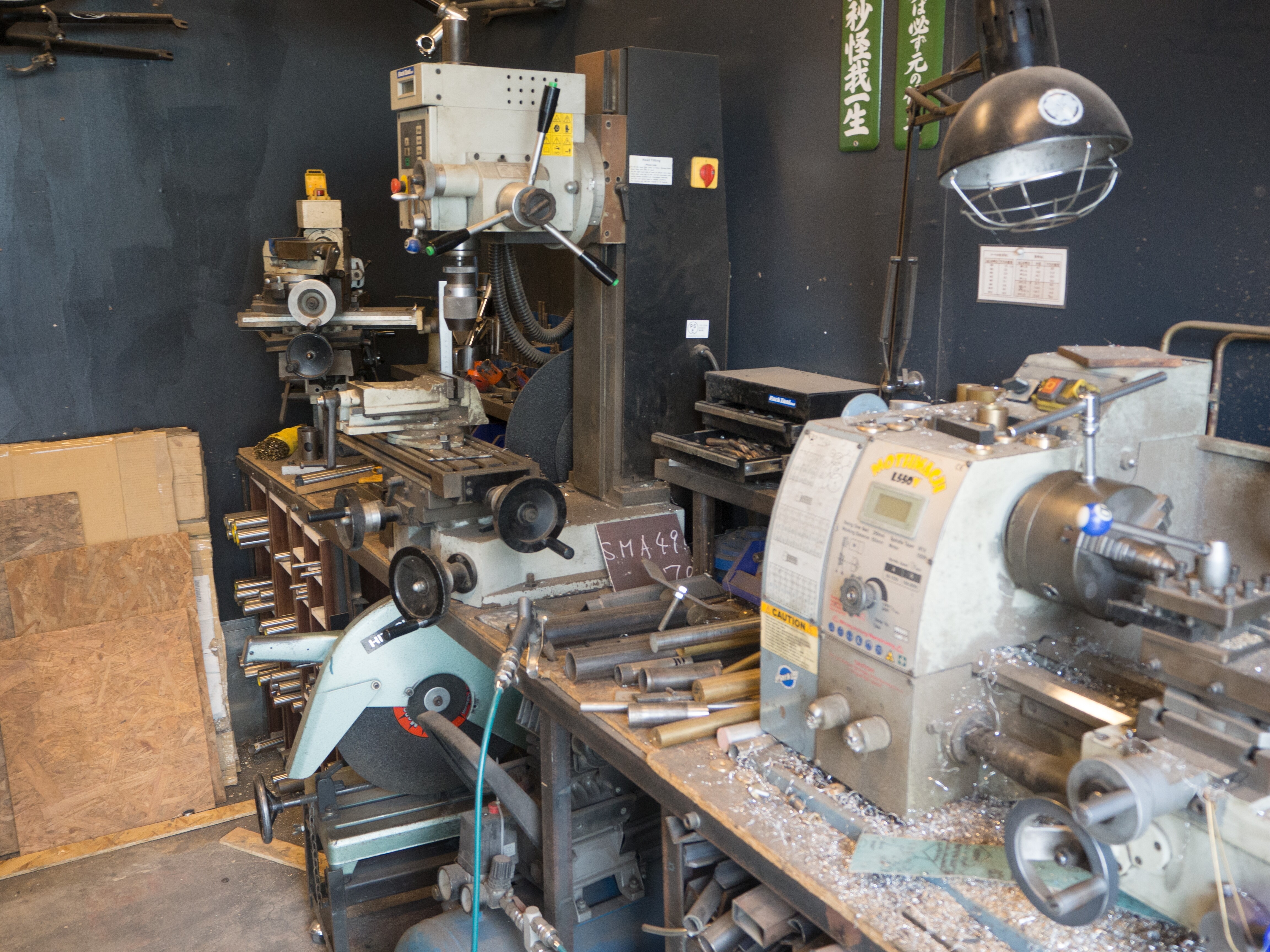 Similar to what Andy said above, we have a “clean” side and “dirty” side of the shop. Sort of. At the center of the space is our big table, which is actually two tables leveled with each other – one super flat surface table, and one Siegmund (the cheap one…) fixture table. Machine tools and welding/brazing tools are lined up around the perimeter. I’m super happy with the setup of the space, but really wish we had windows… A big filtering fume extractor does the work of keeping the air at least not wildly awful.