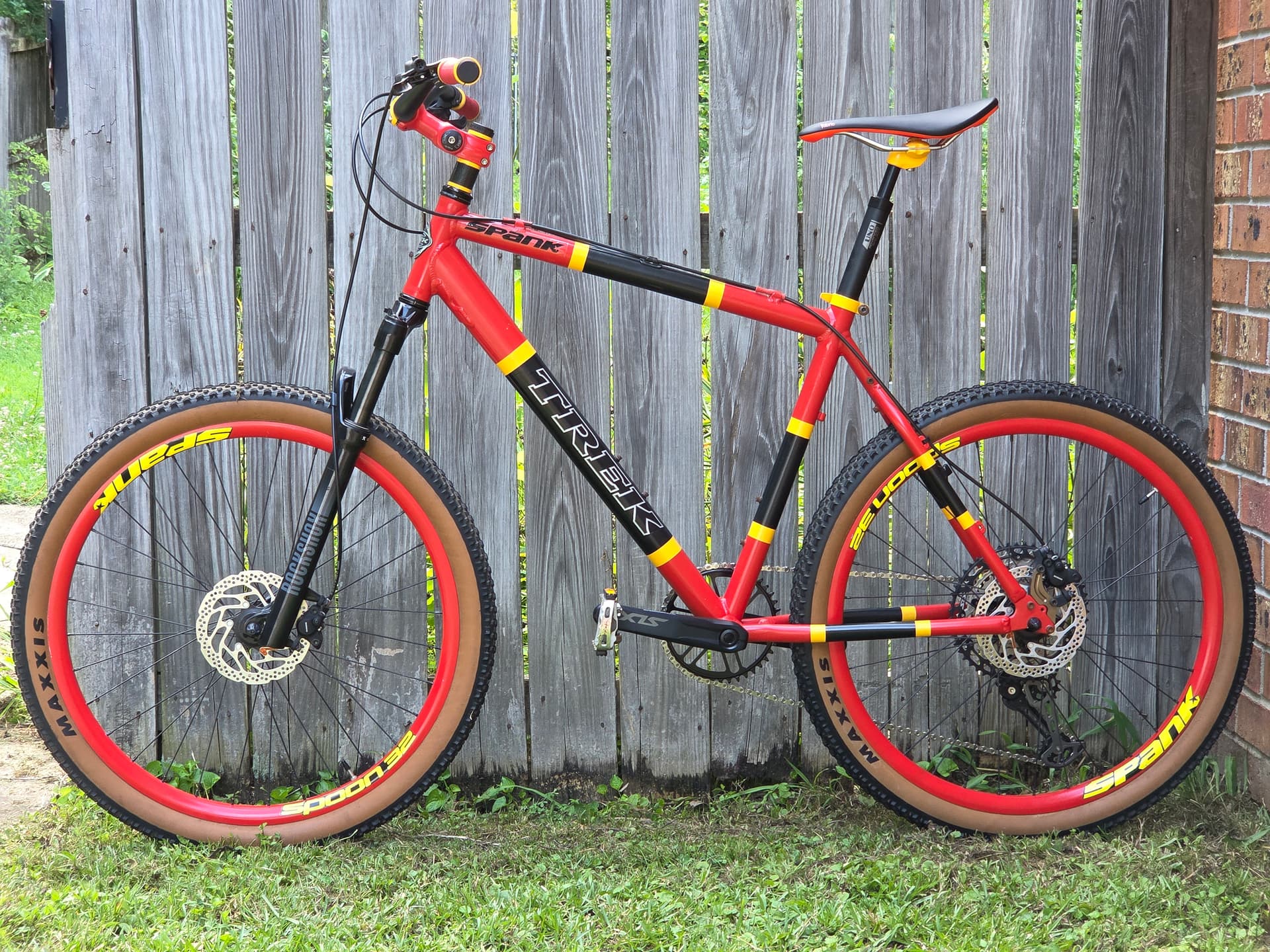 Coral Snake - My first custom build. Started out as a 2004 black Trek 4300. After reading online about trying to jam a 1x12 drive-train onto an old MTB frame, I expected to end up with a noisy, glitchy-shifting bike. After dialing in the derailleur adjustments, this is the smoothest shifting bike I have ever ridden. This bike replaced my go to MTB immediately and I ride it constantly.