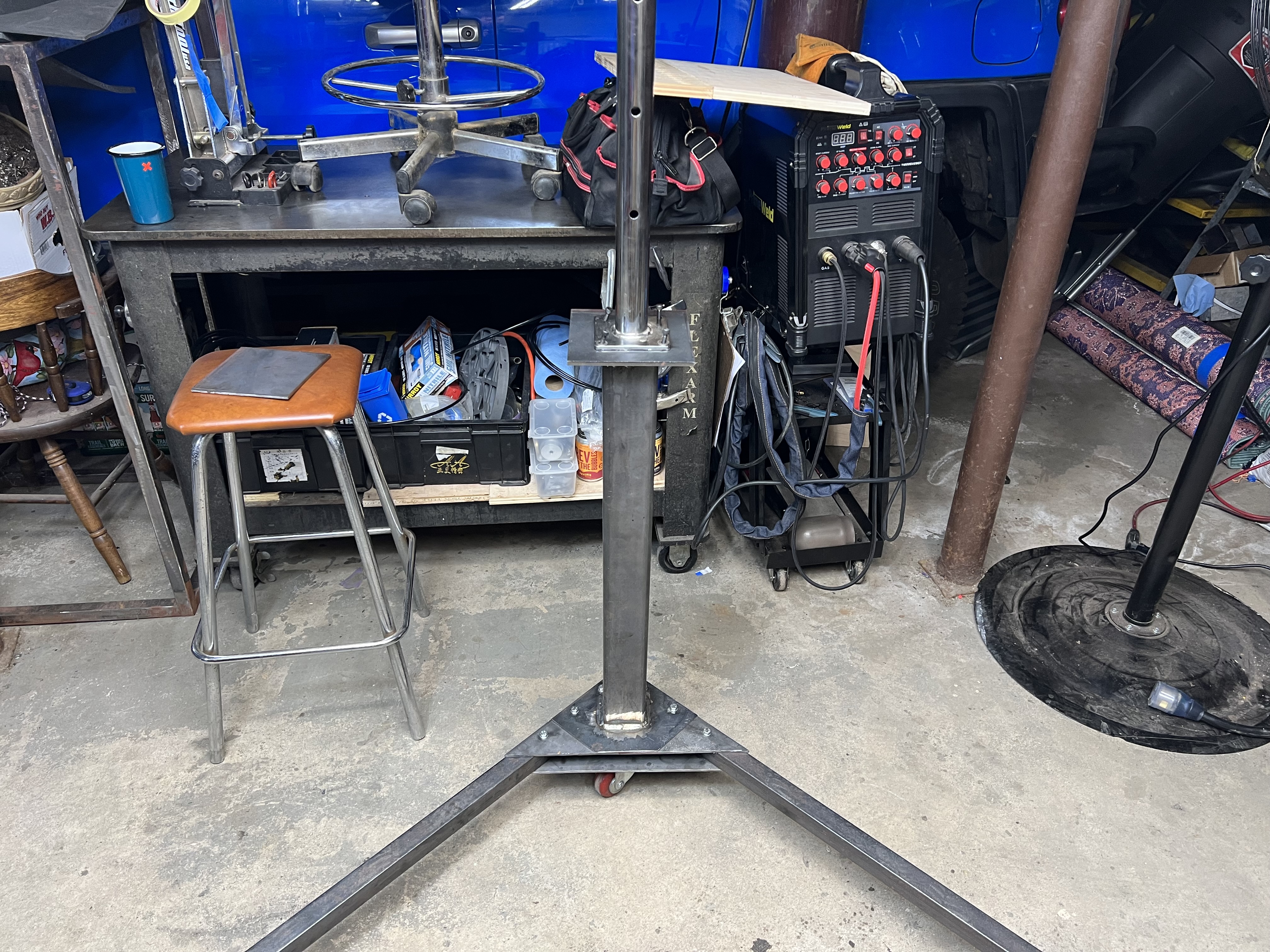If I had to to it again I would make the legs collapsible and allow the fixture to rotate fully vertical to minimize footprint. I would probably pursue a collapsible “V” stand with legs made from nested tubes that slide in and out.