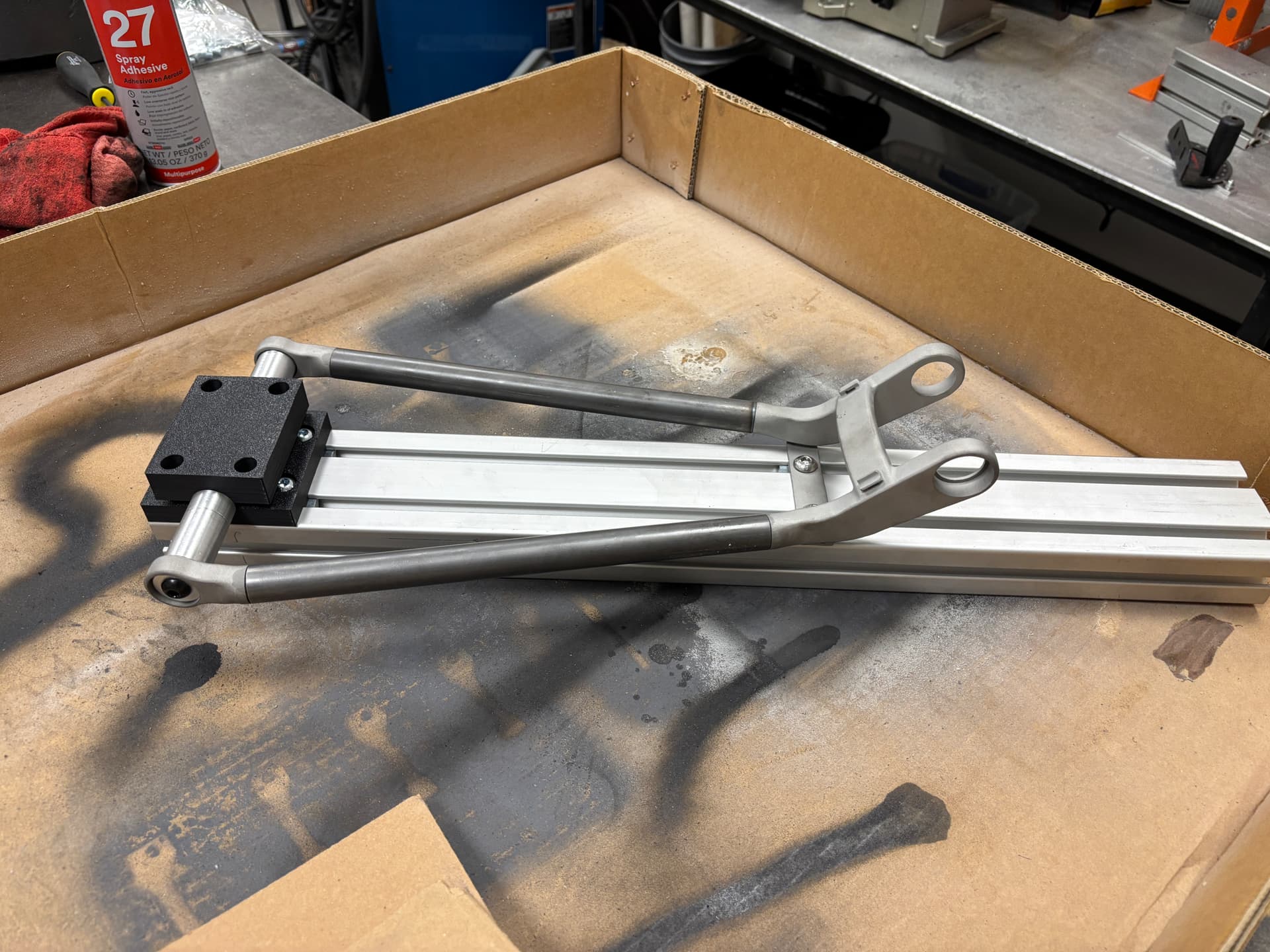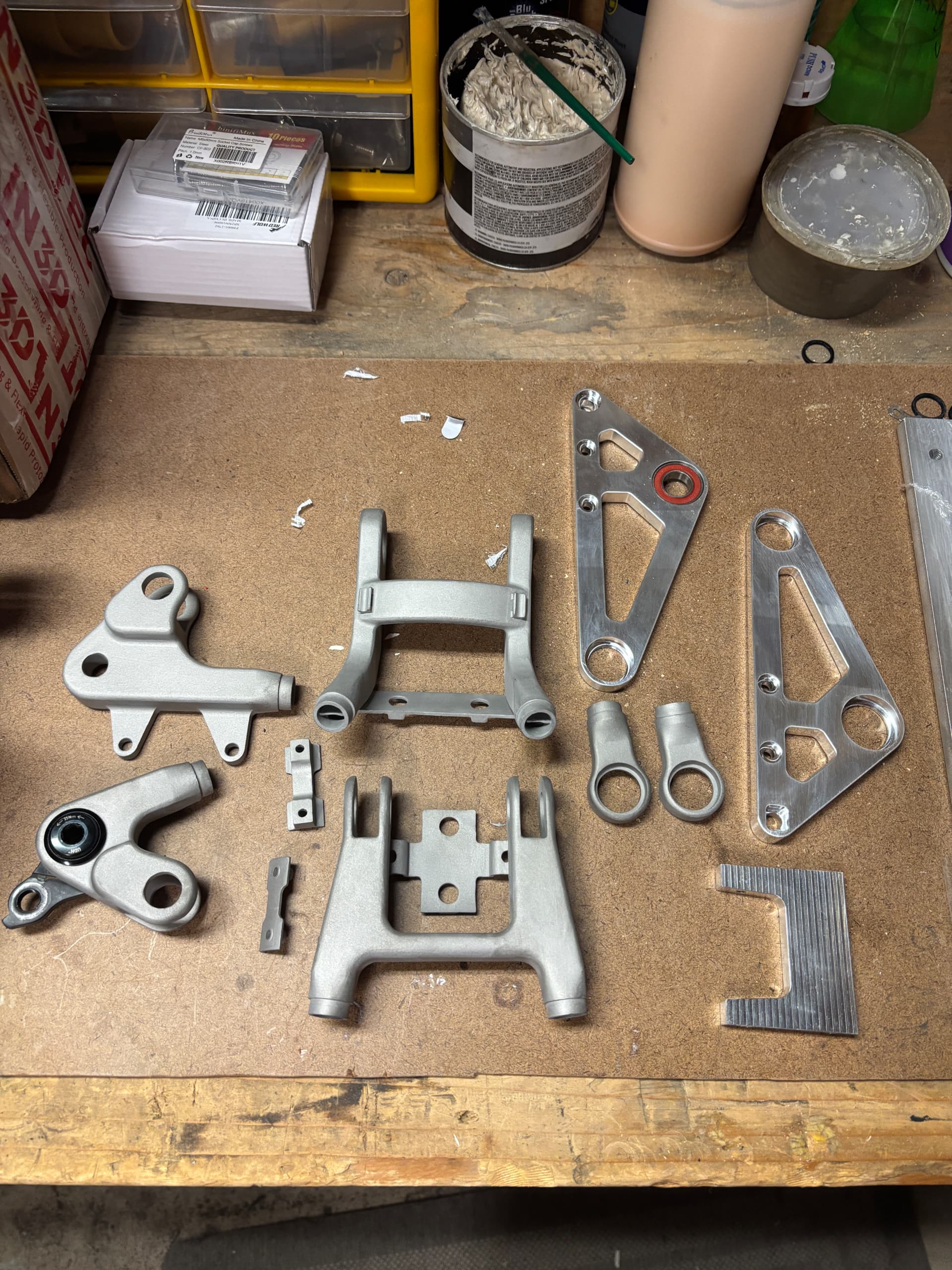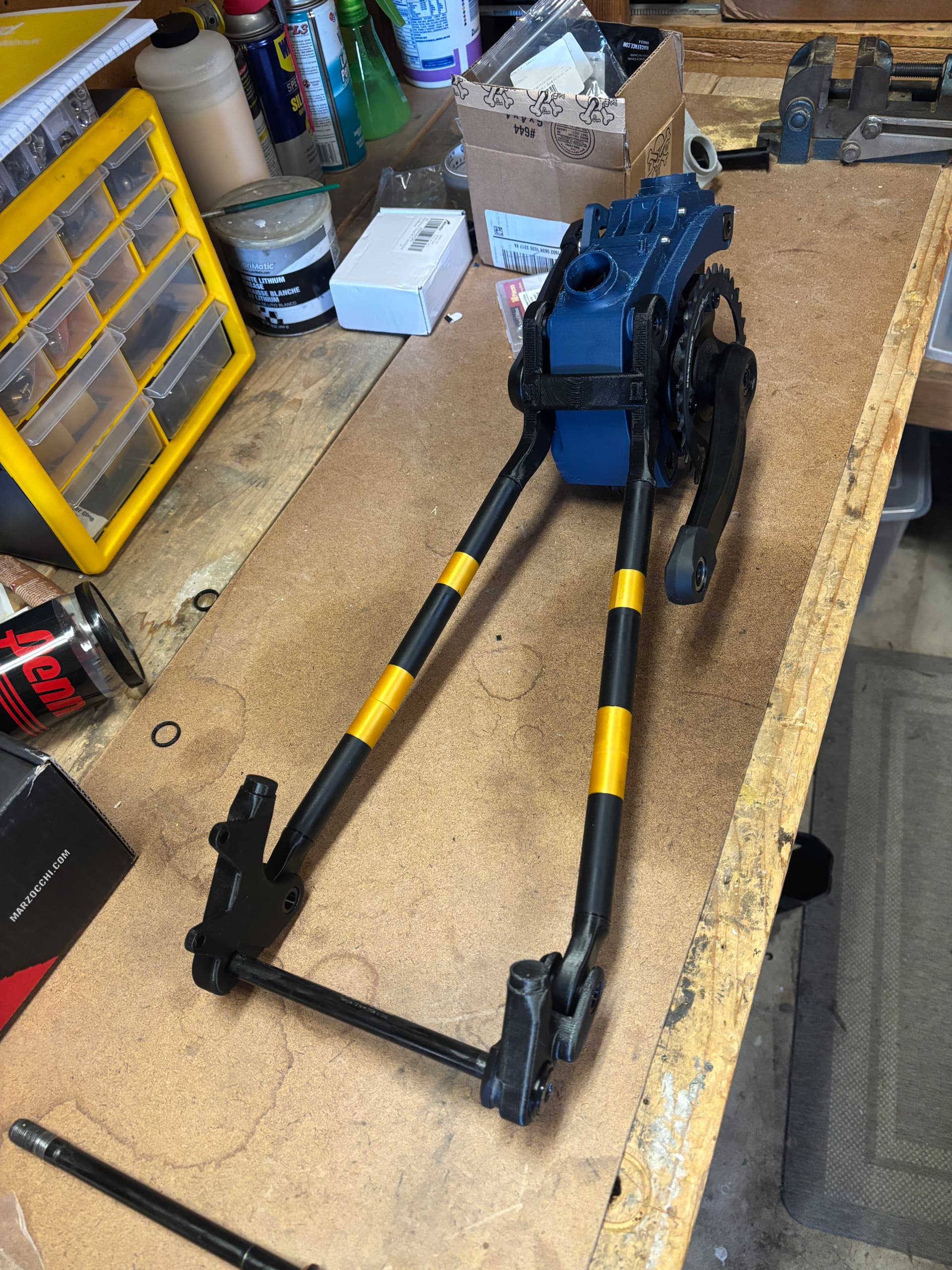 A fair point. I debated that layout for a while but my frame fixturing setup would make that challenging for me. With this setup I can get the shock mount and main lower pivot in one go on my current jig with fewer machined parts at the cost of the CG being a few millimeters higher.