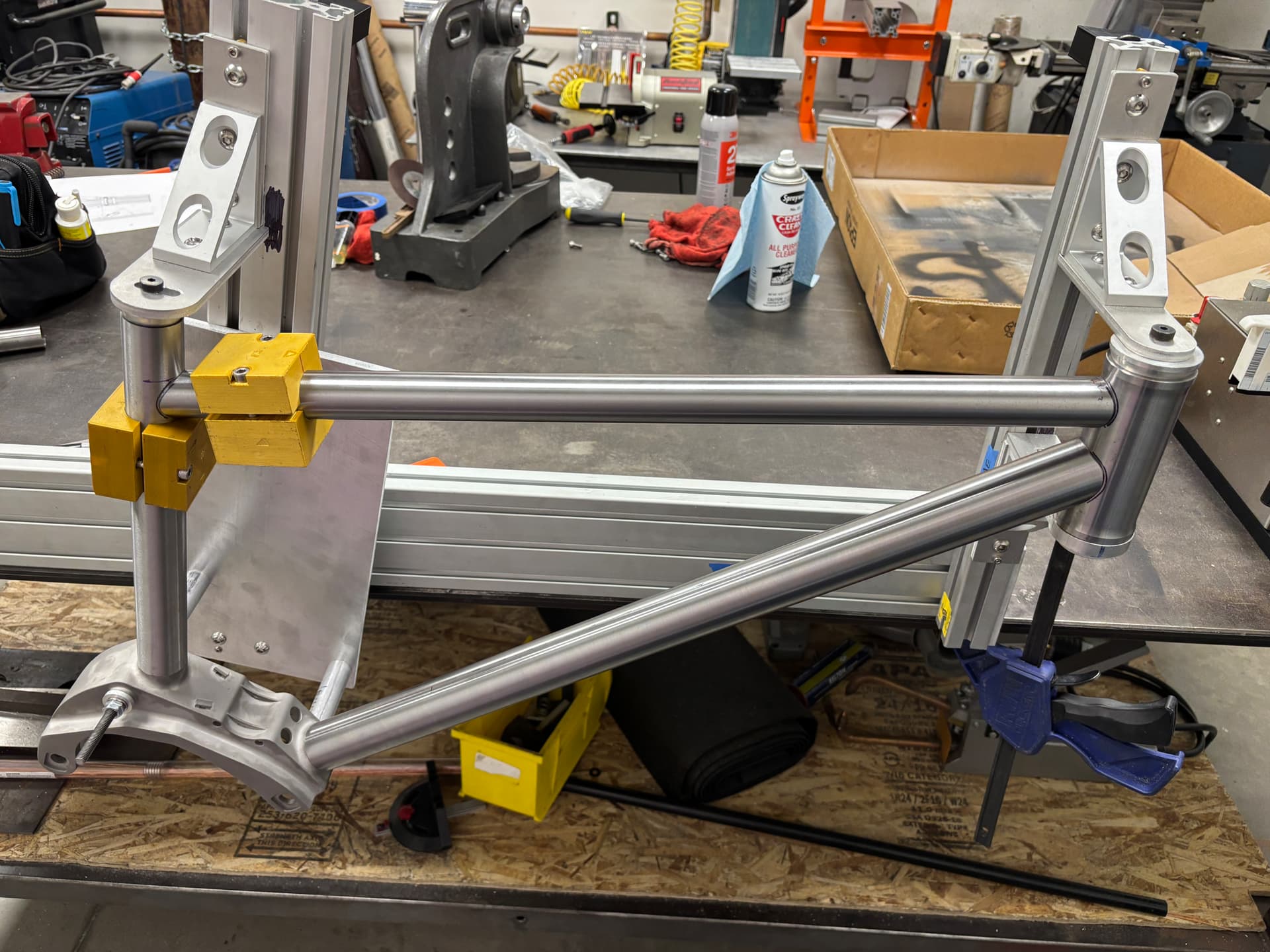 I have the tubes cut and my jigs all setup. I didn’t notice until too late that my 44mm hole saw is wobbling so it made some over sized holes. So I will have to order new DT and TT and a new hole saw which is annoying. I could probably make the DT and TT work but I am not a good enough welder to do so reliably. It looks like my built in fixturing is lining up nicely. The real test is how straight it is after welding.