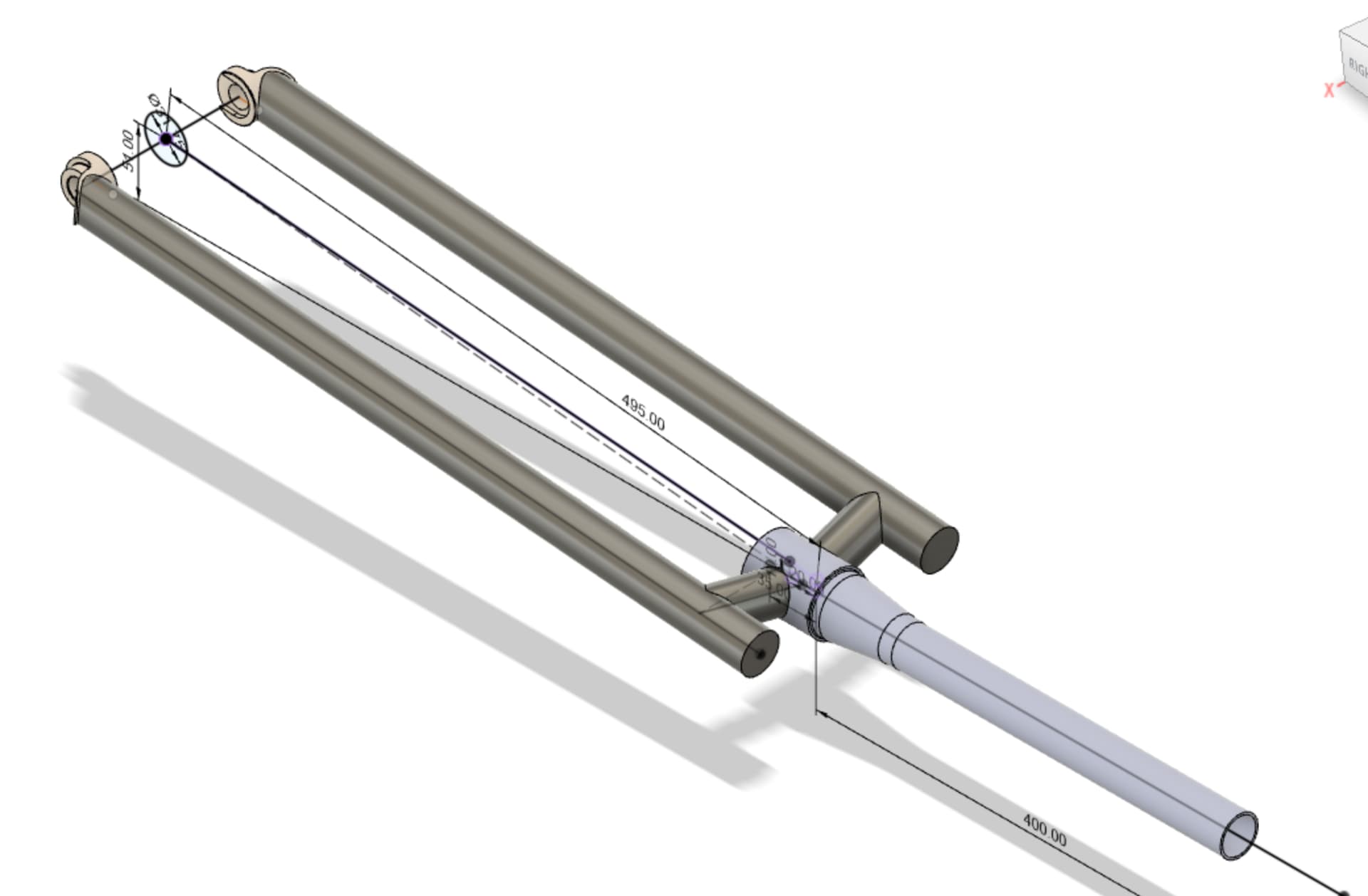 Here’s my base sketch showing profile view of the fork. The 10mm is an offset for leg centerline to steerer centerline