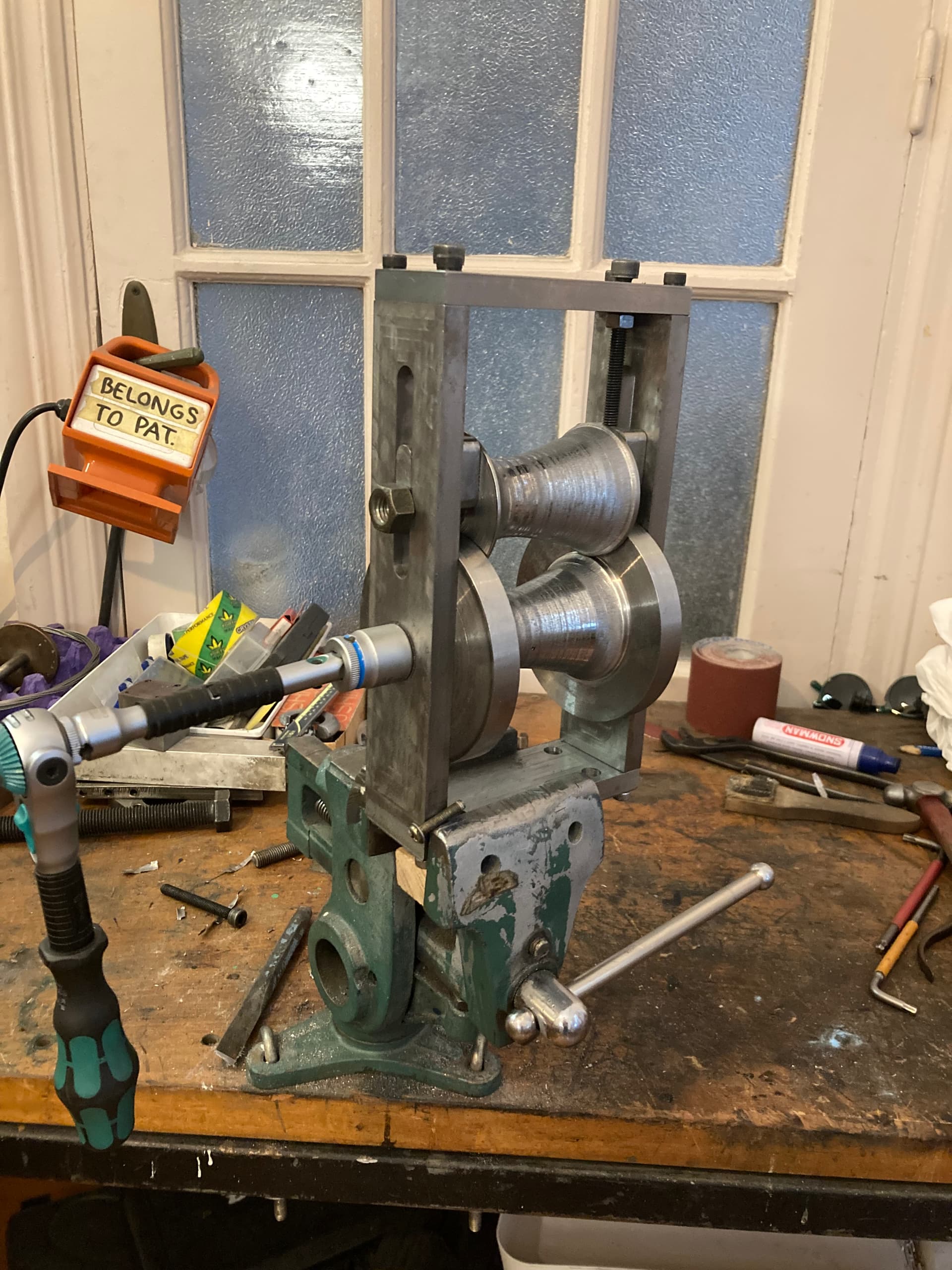 after dreaming of ludicrous teardrop downtubes and battling through either dealing with pre-made options which are thicker than id like, or struggling away making my own a few times, I saw Clive Gillum pull this little number out of the hat; way too simple to be effective, I thought; but I was wrong. he’s making tubes the shapes he wants with it.