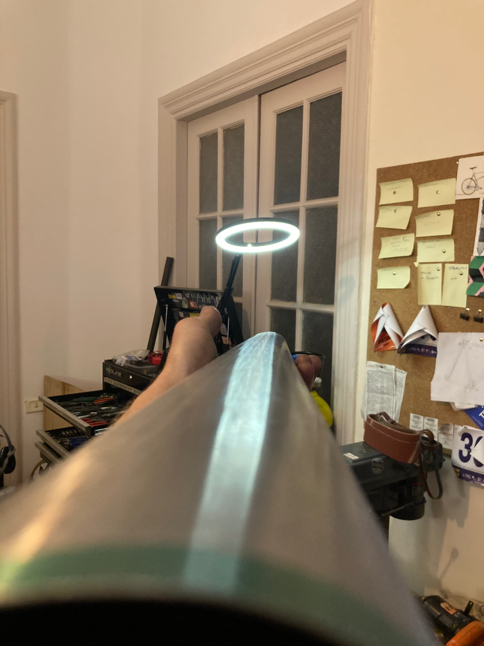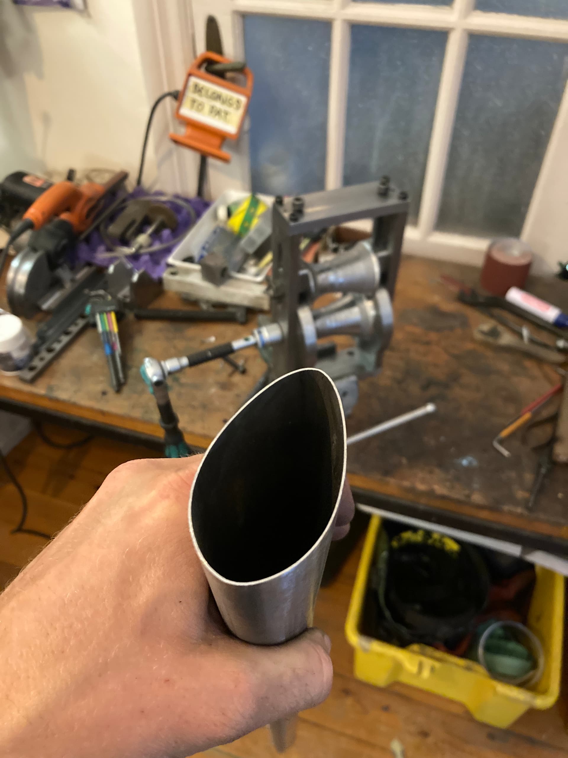 the starting tube was 0.75mm wall ~51mOD straight gauge, the finished shape is 33.5 x 65.5, probably have to lose about 60mm of either end but there’s plenty of length so no worries there.