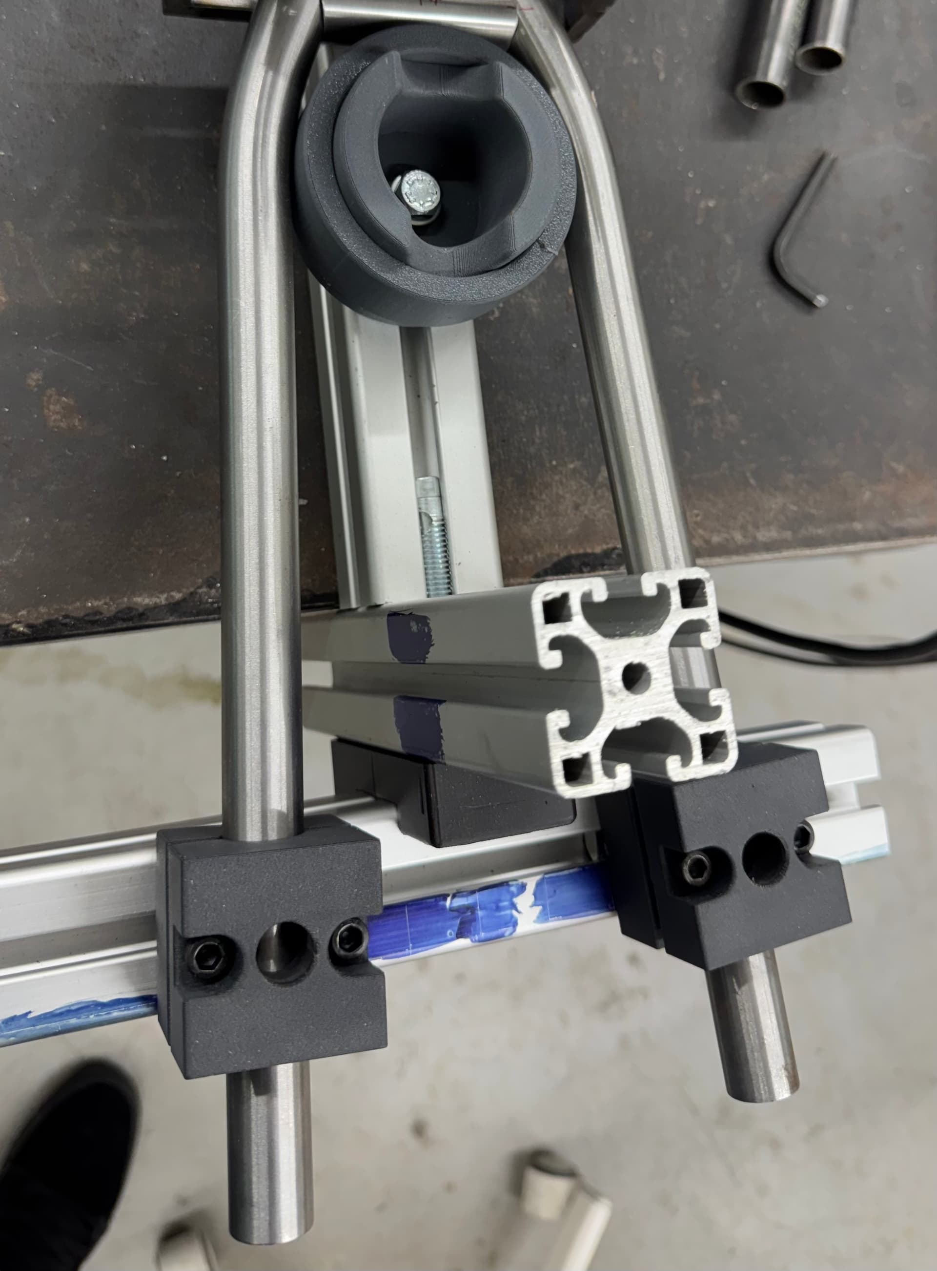 the floating roller is held up only by the tube, and pushed down on each side by an M8 screw. very basic setup, so far entirely functional.