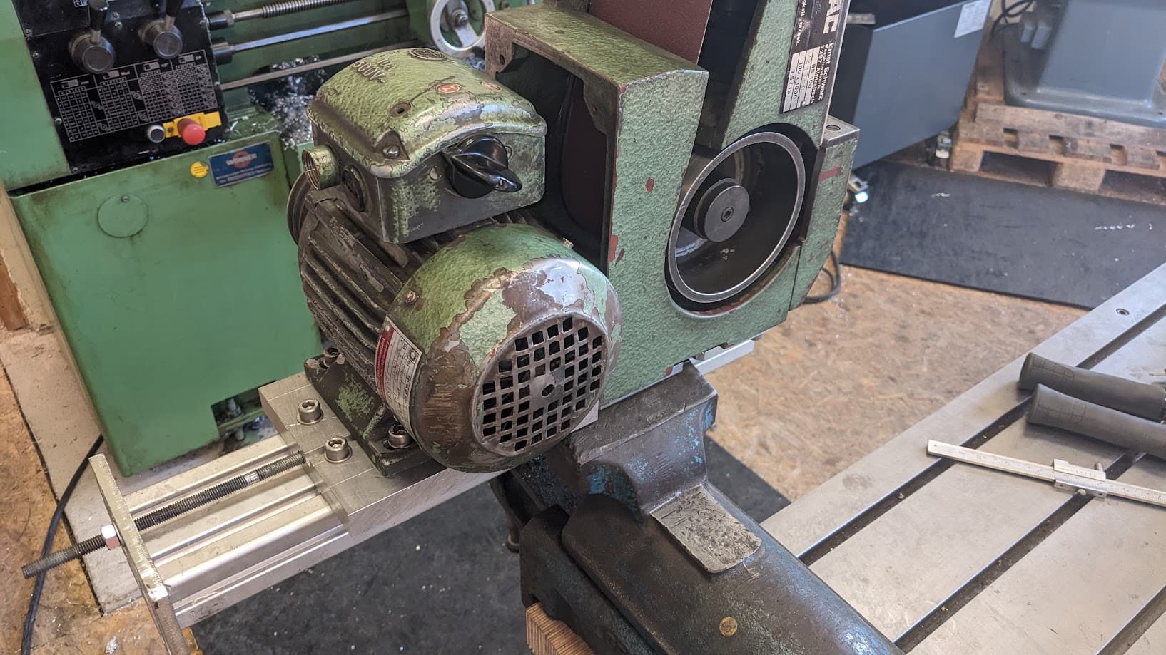 First, I took 2mm off the top surface and bolted on some stainless I had in the shop, then decided it would be much better if the whole arrangement was upright, so bolted the grinder and the motor to a piece of alu extrusion, including a belt tensioning feature