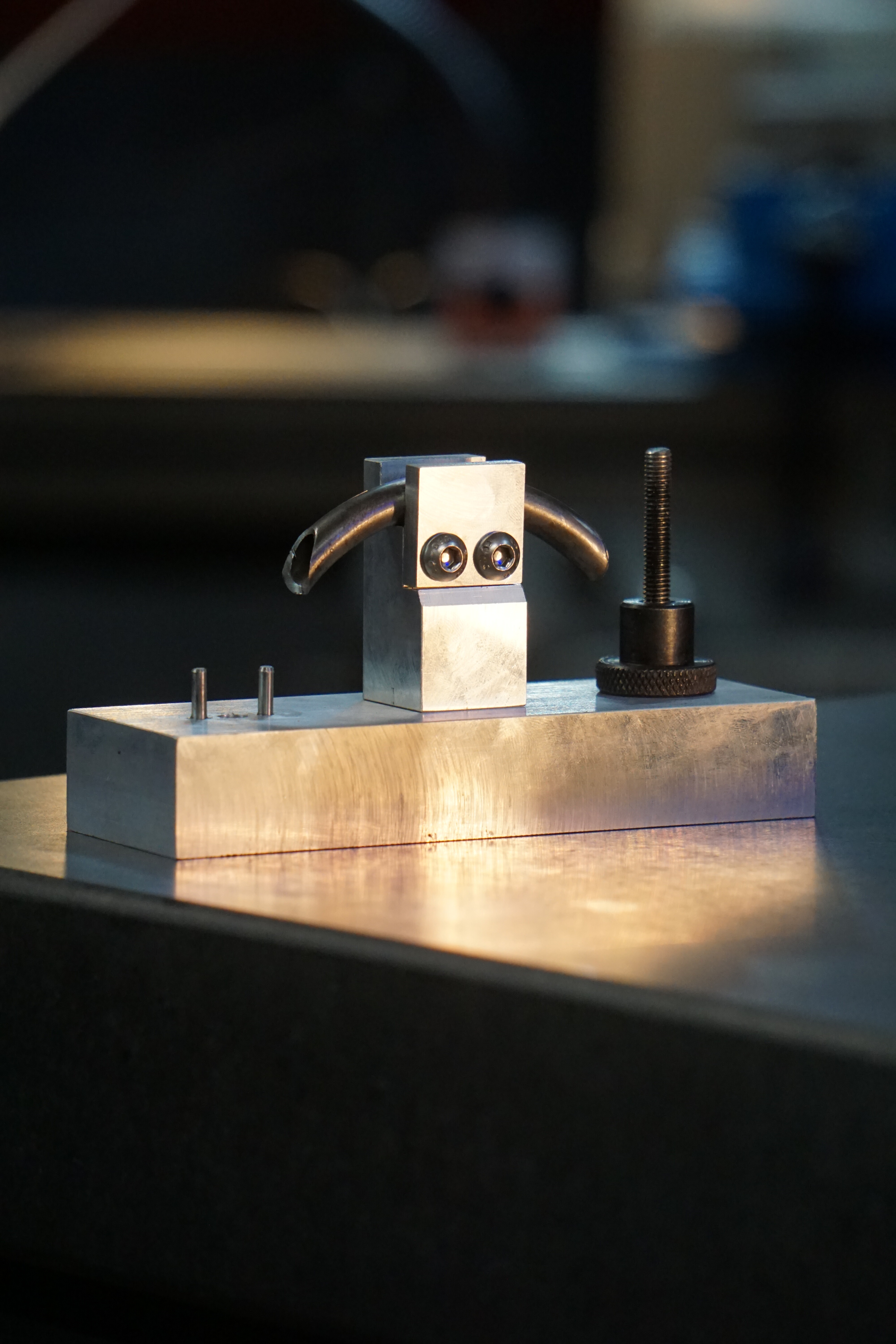 I’ve been working on a brake boss fixture – here’s V1 helping me put some center pull bosses on a friend’s bike… it was quite a good test to see what I want to change for next time, but it also worked well enough. V2 will have a wider axle clamp to self-center reduced-center axles, move the engraved scale closer to the center to make it easier to visually align the clamp, self-centering upper axle with a scale for widths added there as well. The Anvil version of this tool was an inspiration of course.