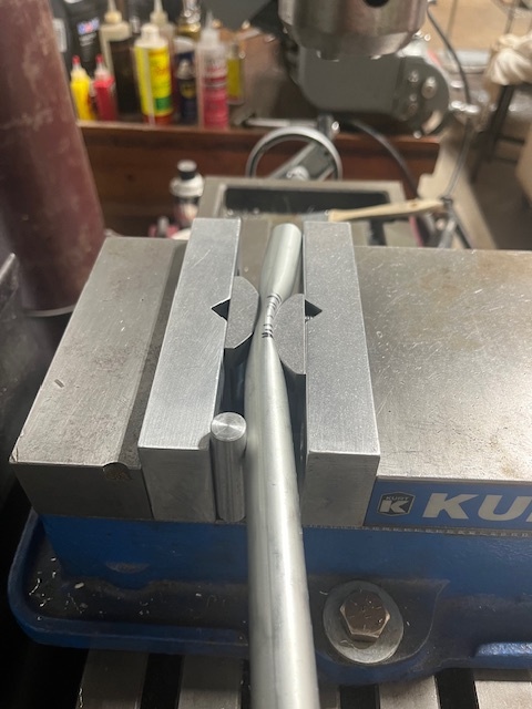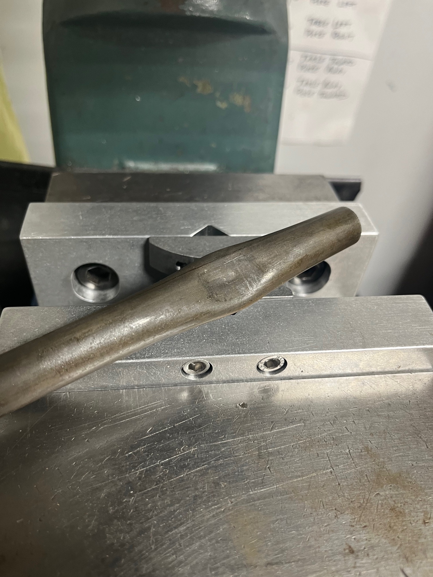 The post from OAR Engineering got me thinking if I can incorporate a slight bend in the chainstay during the dimpling process using the woodruff keys in the milling machine vice. I offset the woodruff keys and added a spacer. Might need some refinement, but it works pretty good.