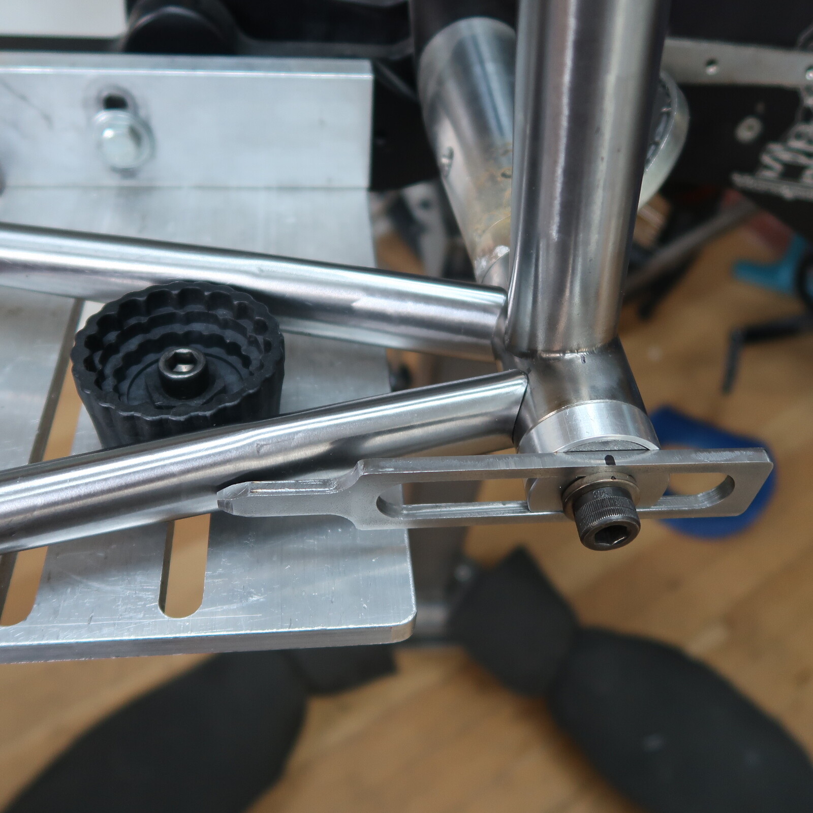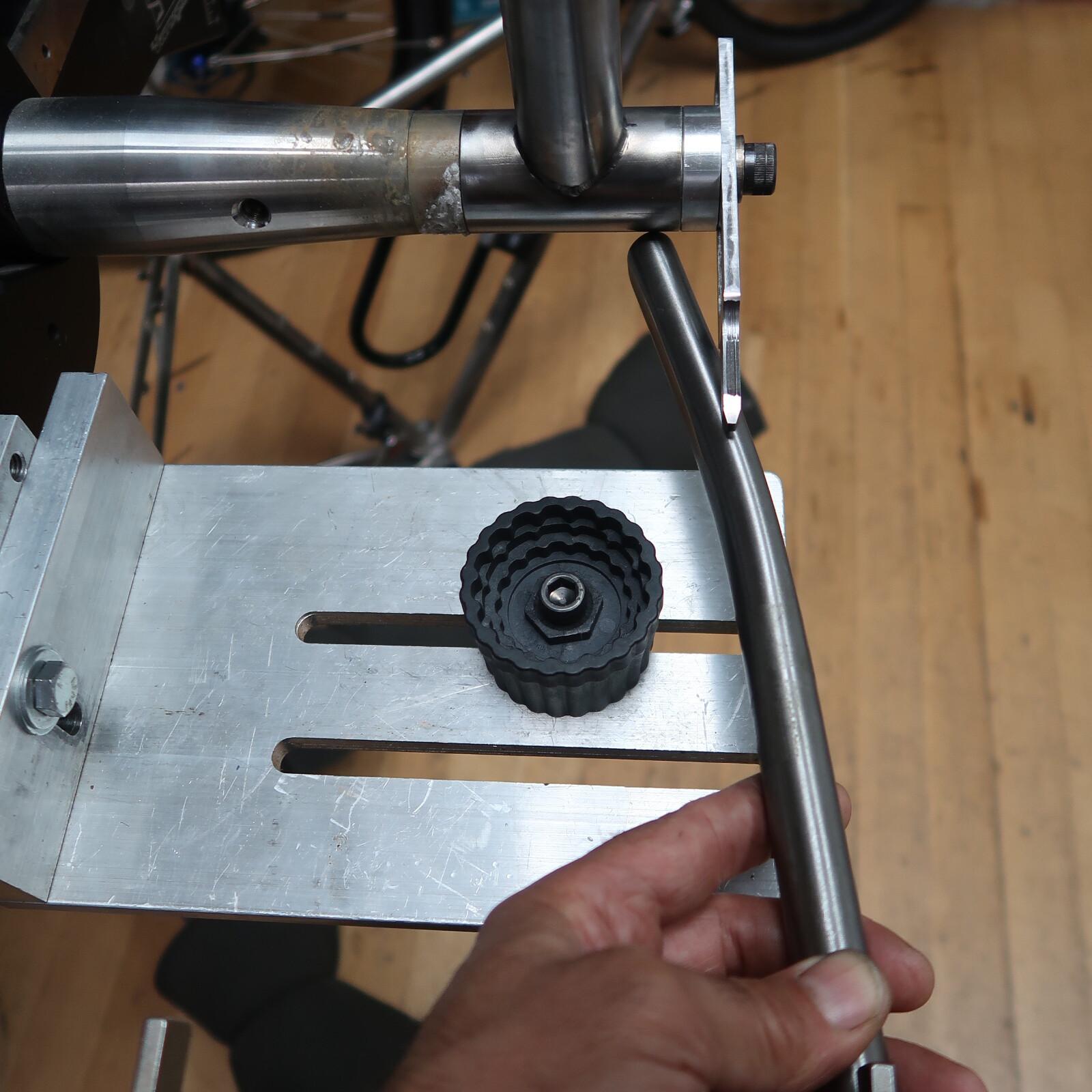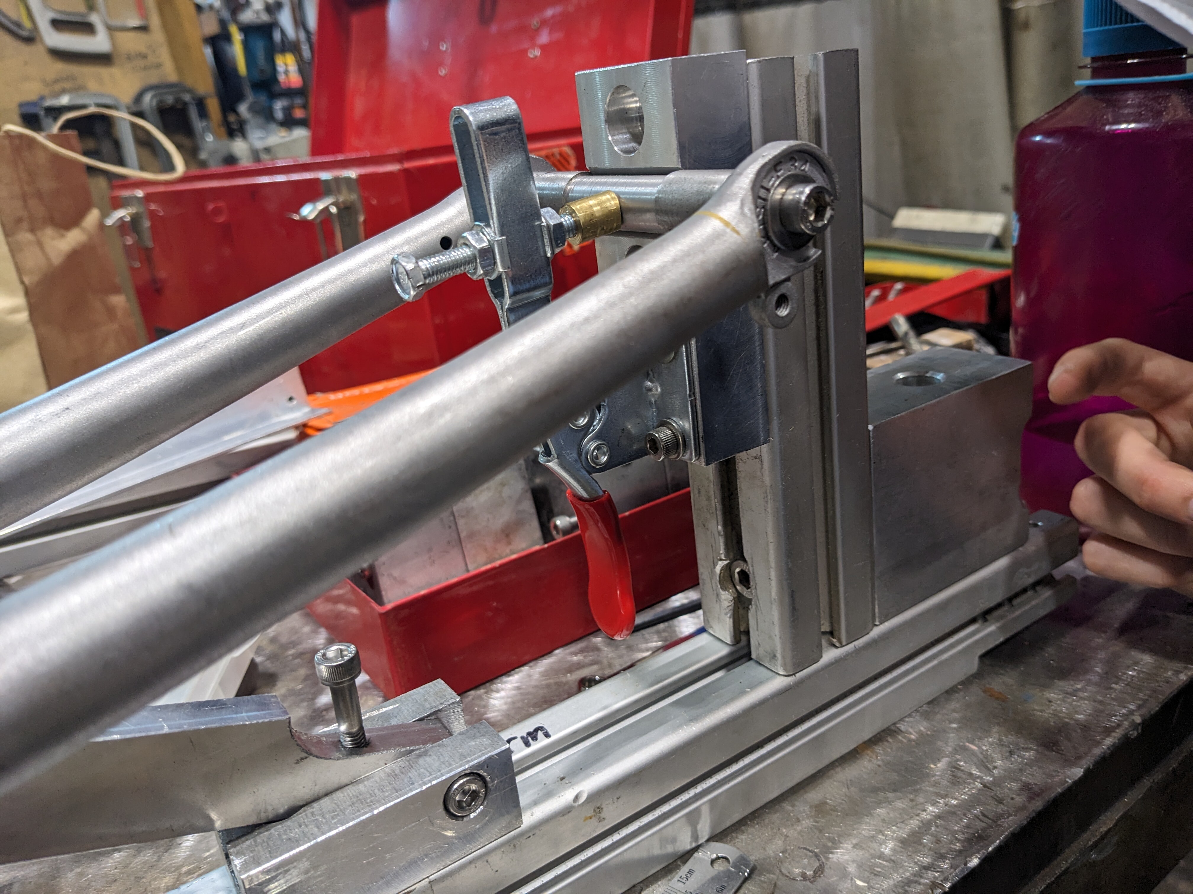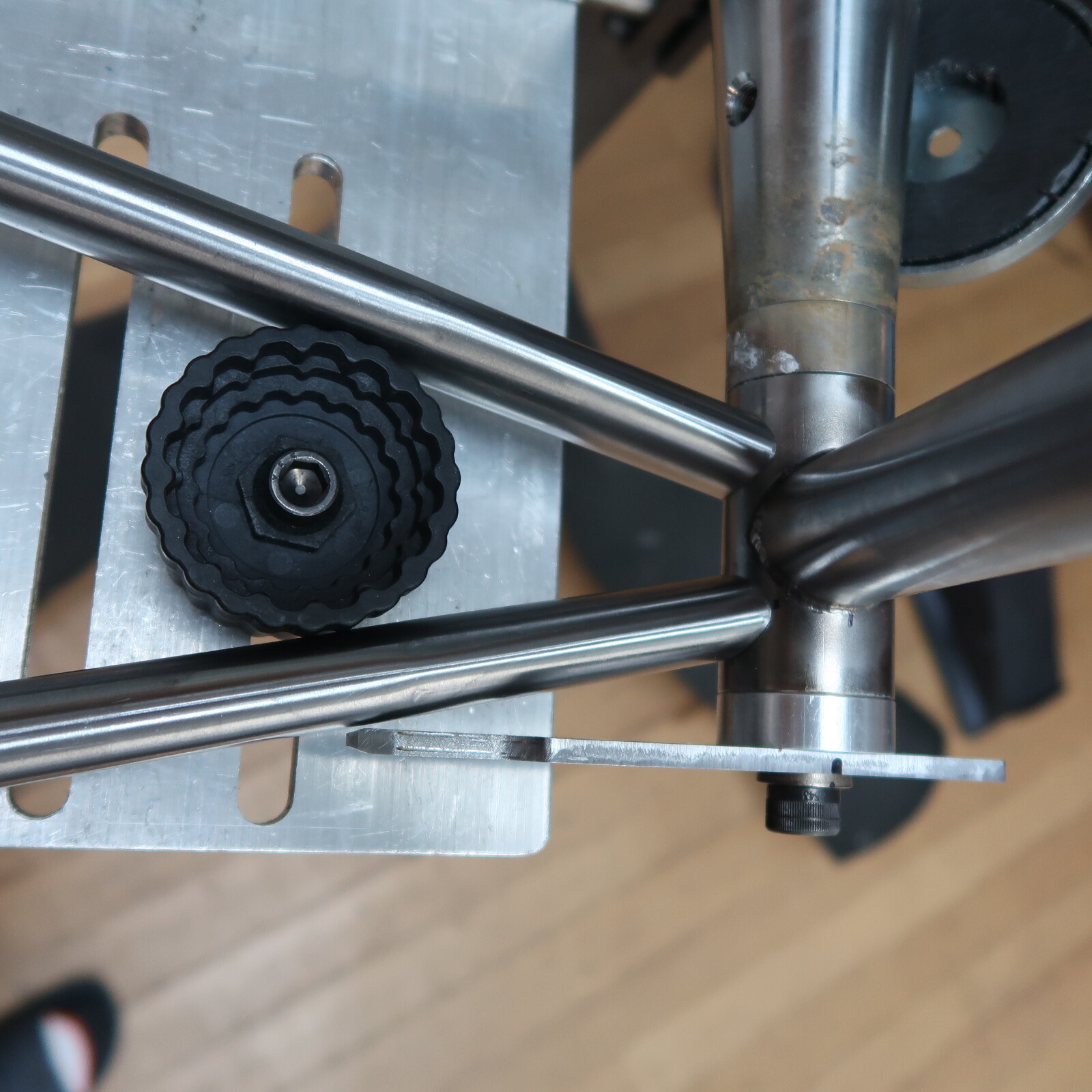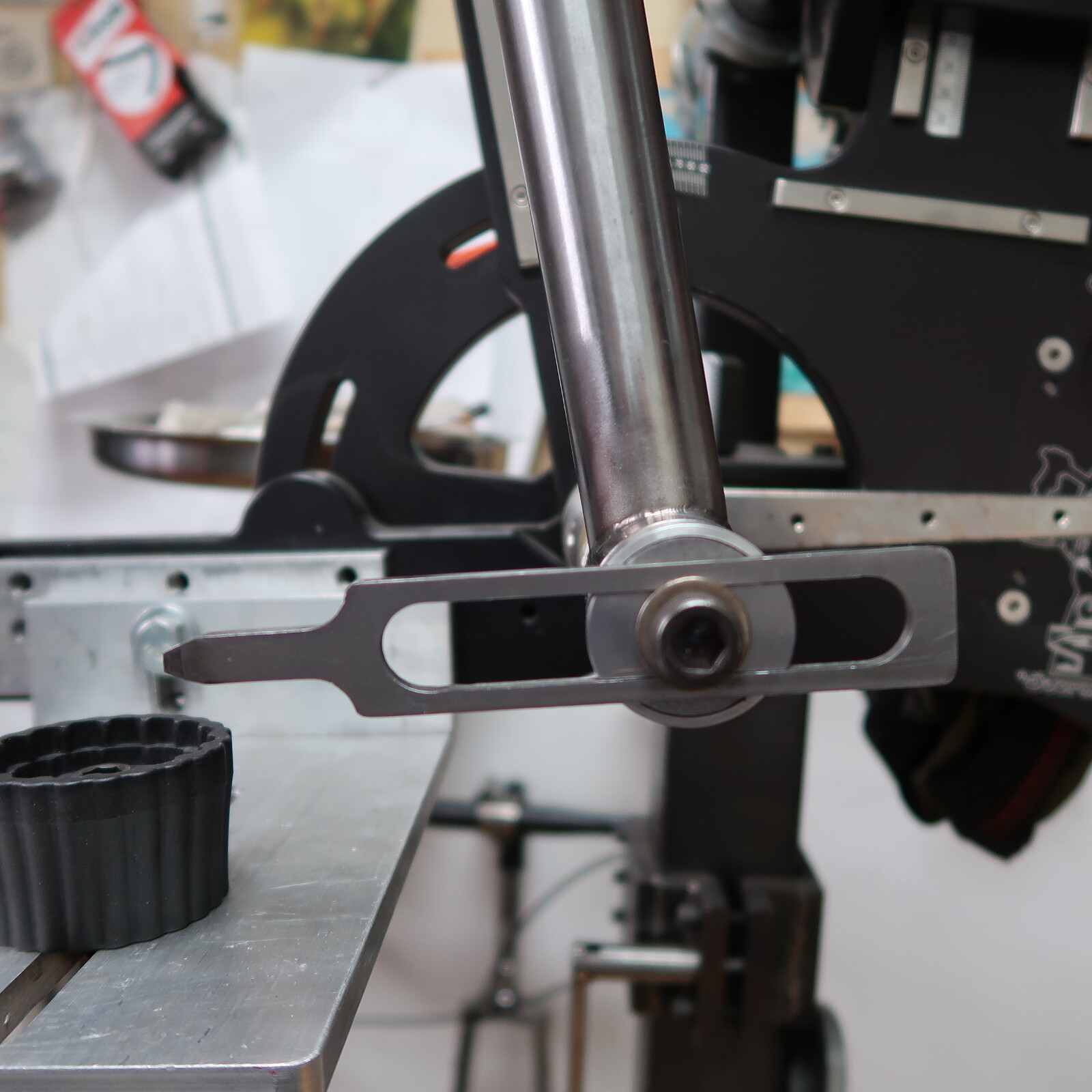 I’ve been updating my fork jig recently. Really pleased with how it’s turned out. The parts were all machined manually on an old excello mill at my community workshop. All of the machined pieces have a ridge on the bottom so that they accurately mate against the extrusions. I’ve used quick clamps to make it easier to load and unload the steerer and dummy axle. And made a little articulating support bar to hold up the fork blades that can be fine adjusted using the m6 screw