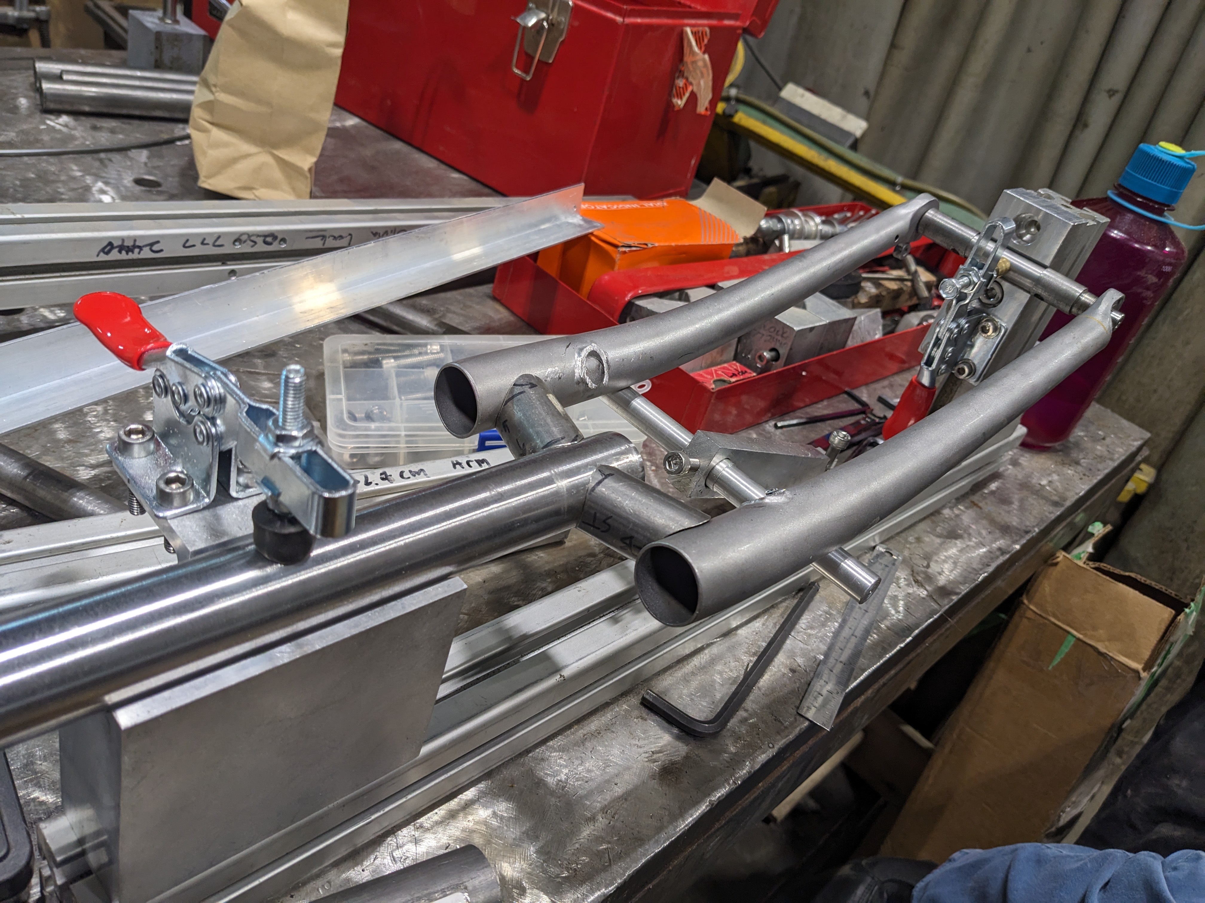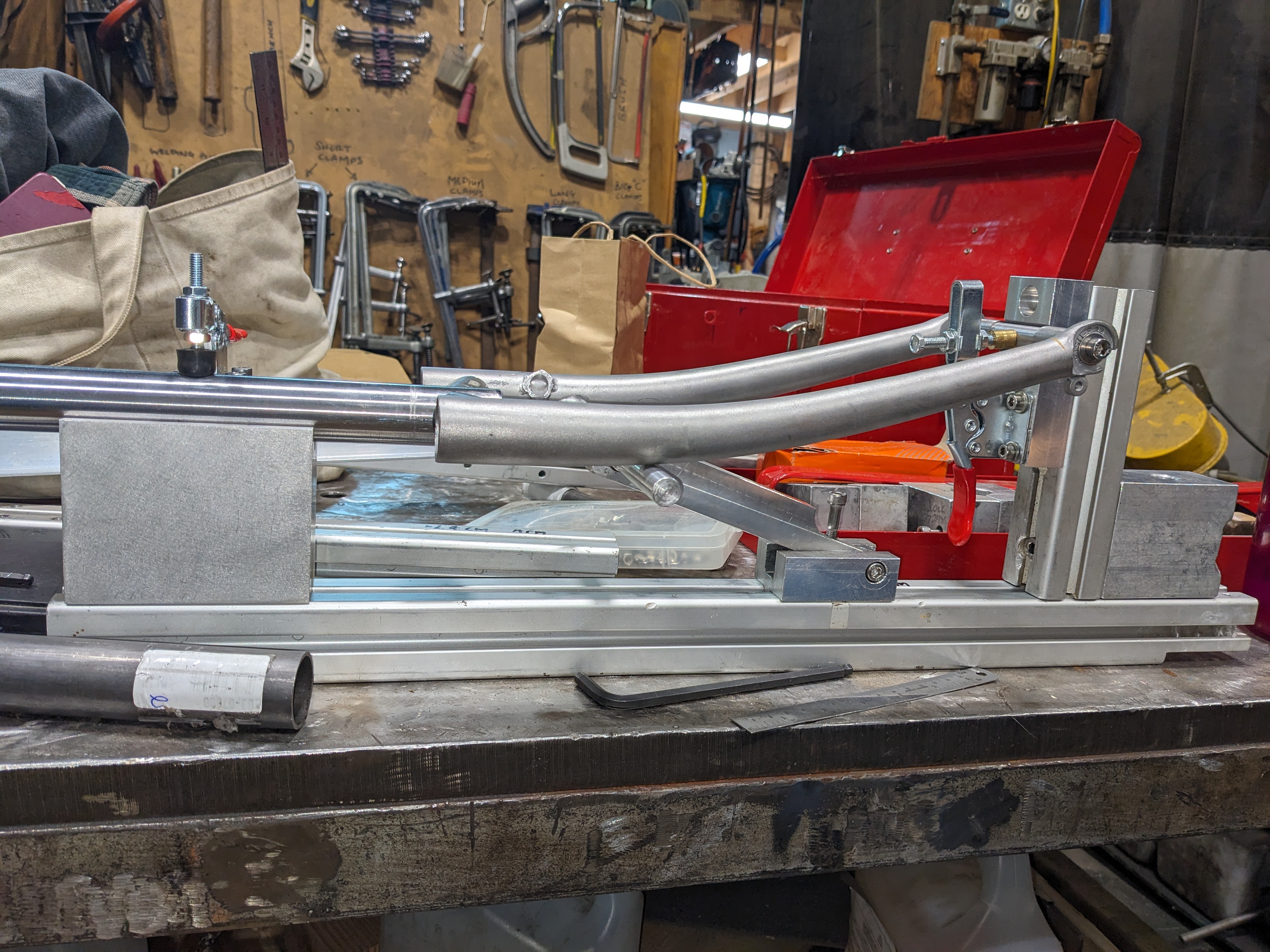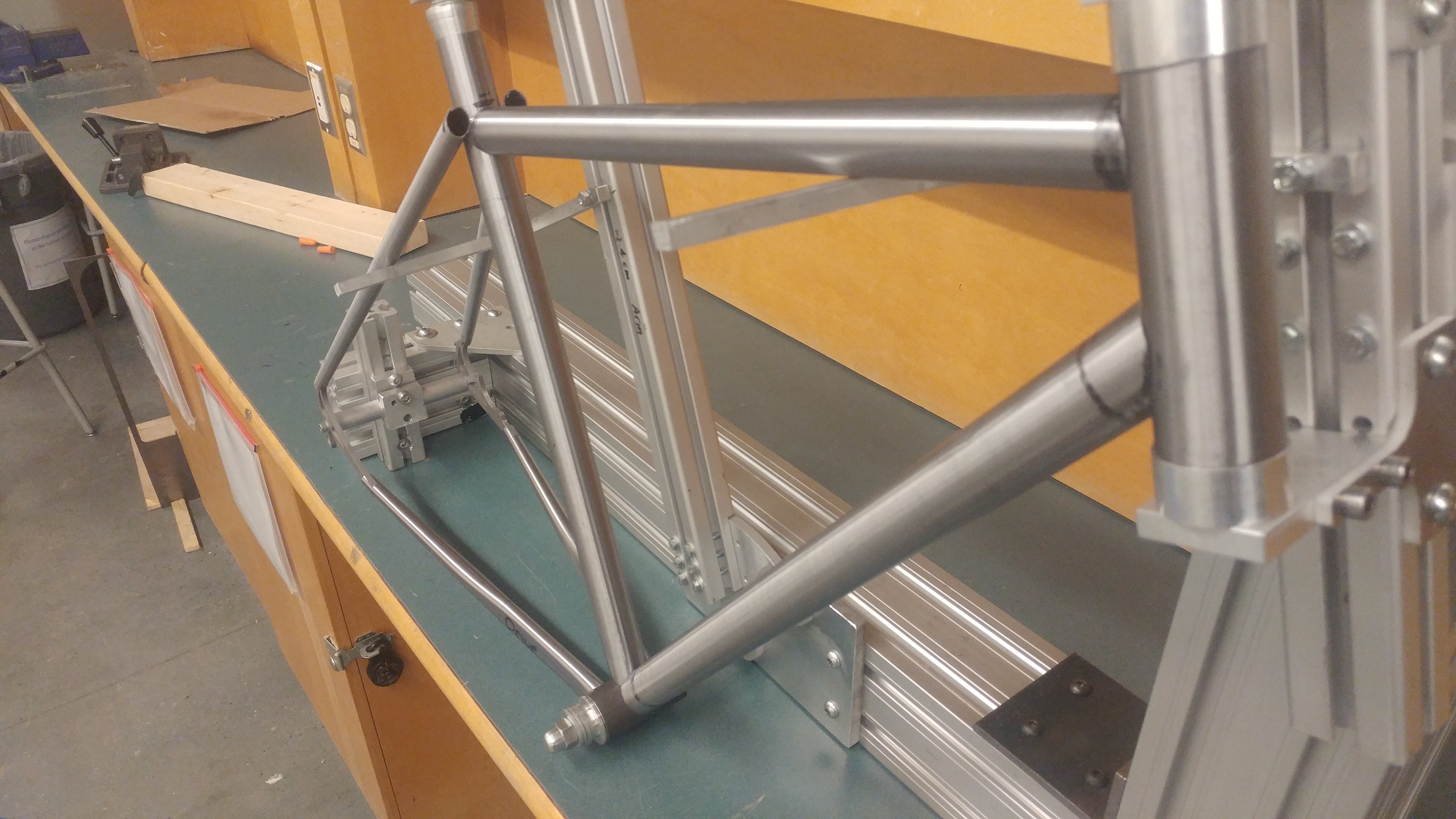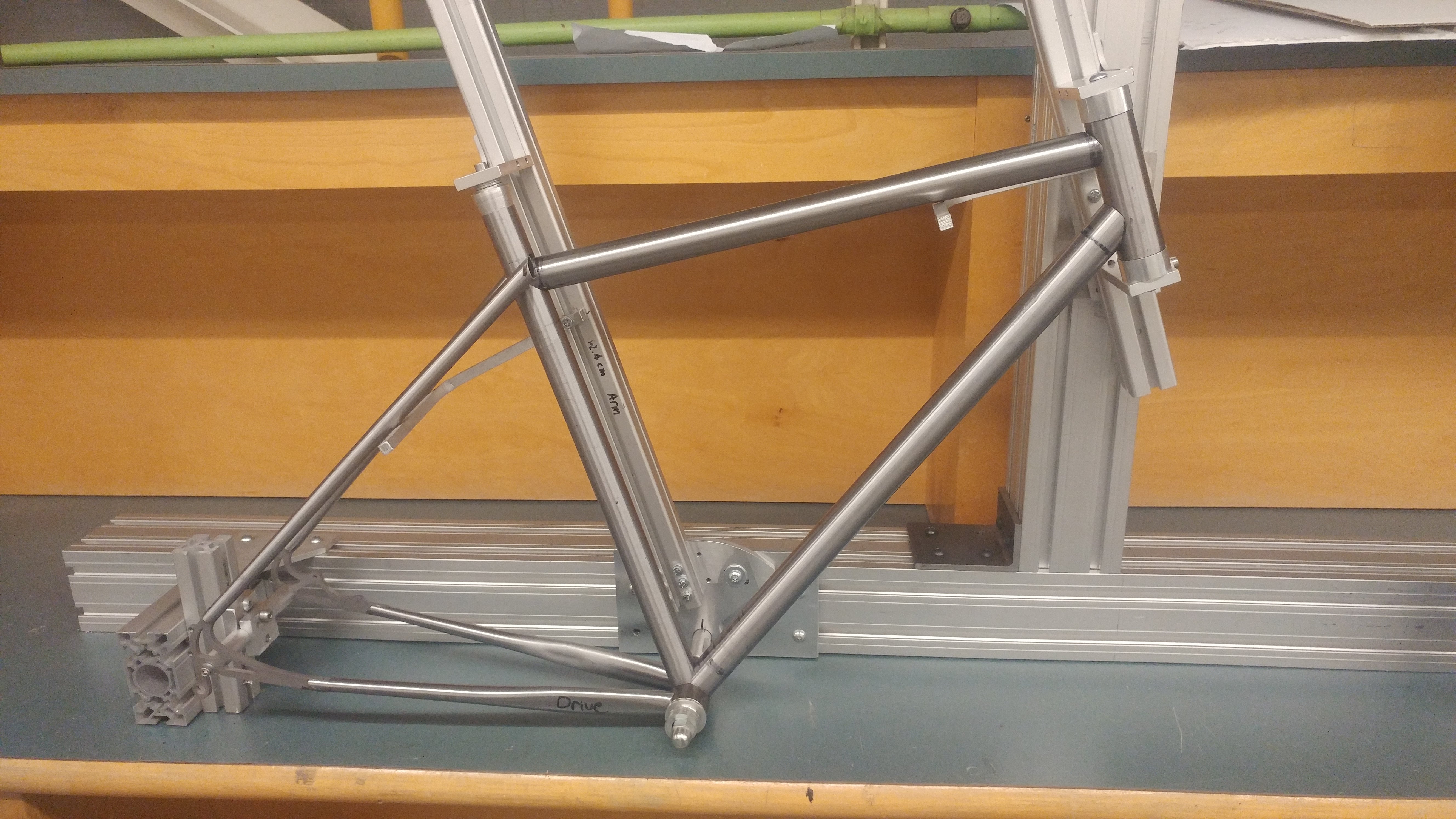 Heres my frame fixture, currently without the rear axle assembly aattached. I made it several years ago (while in engineering school) based around some hand me down extrusions and I have since learned a lot that I owuld do differently. Its a pain in the butt to set up and taking tubes in and out typically requires undoing at least 4 bolts. This isn’t the end of the world as a hobby frame builder who builds less than one bike per year. But it also doesn’t have any good way to measure the position of the headtube or the axle. This is more annoying and something I would defenitly like to improve on one day. I don’t mind not having angle markings because I find my digital angle finder does an okay job.