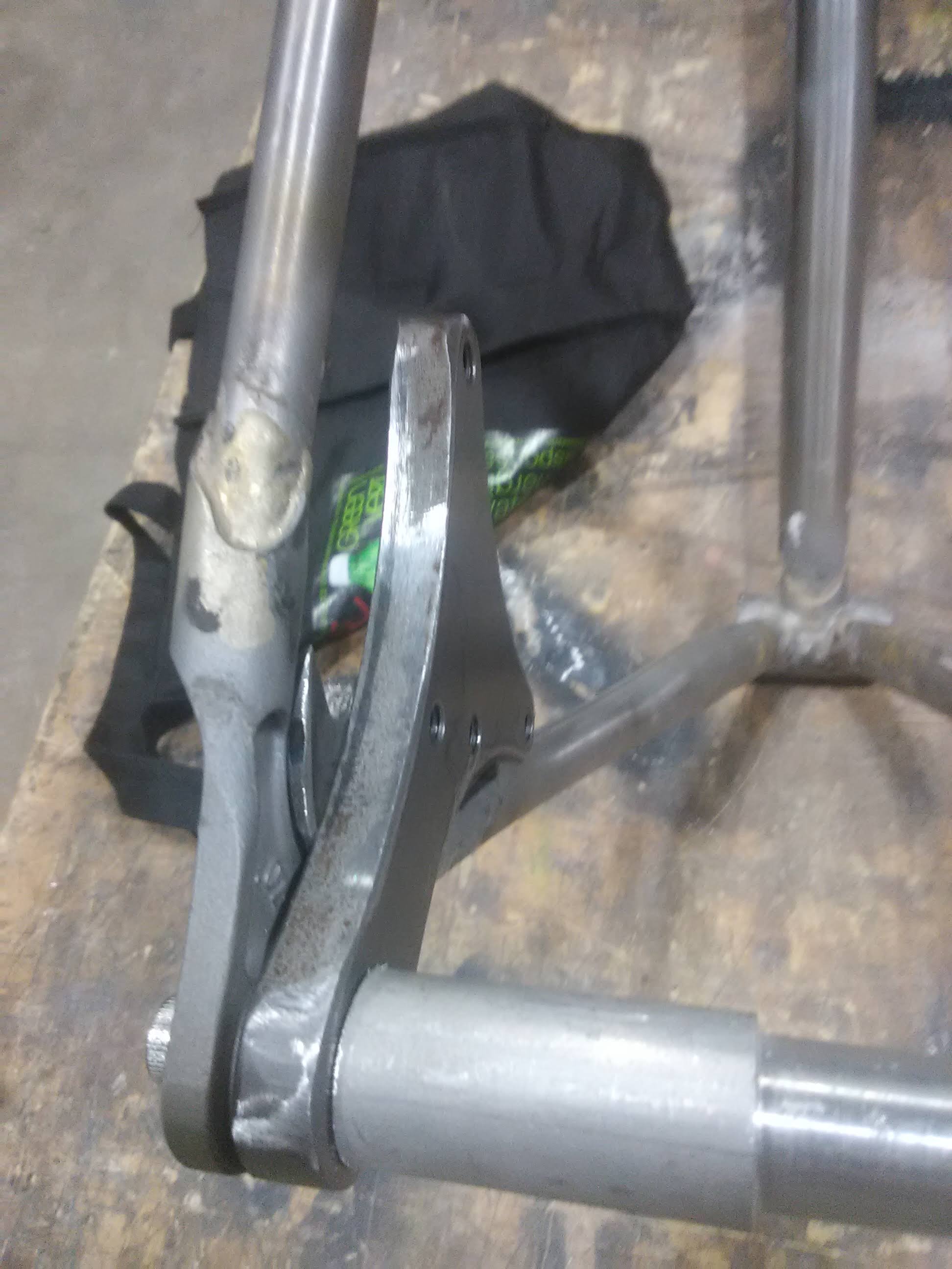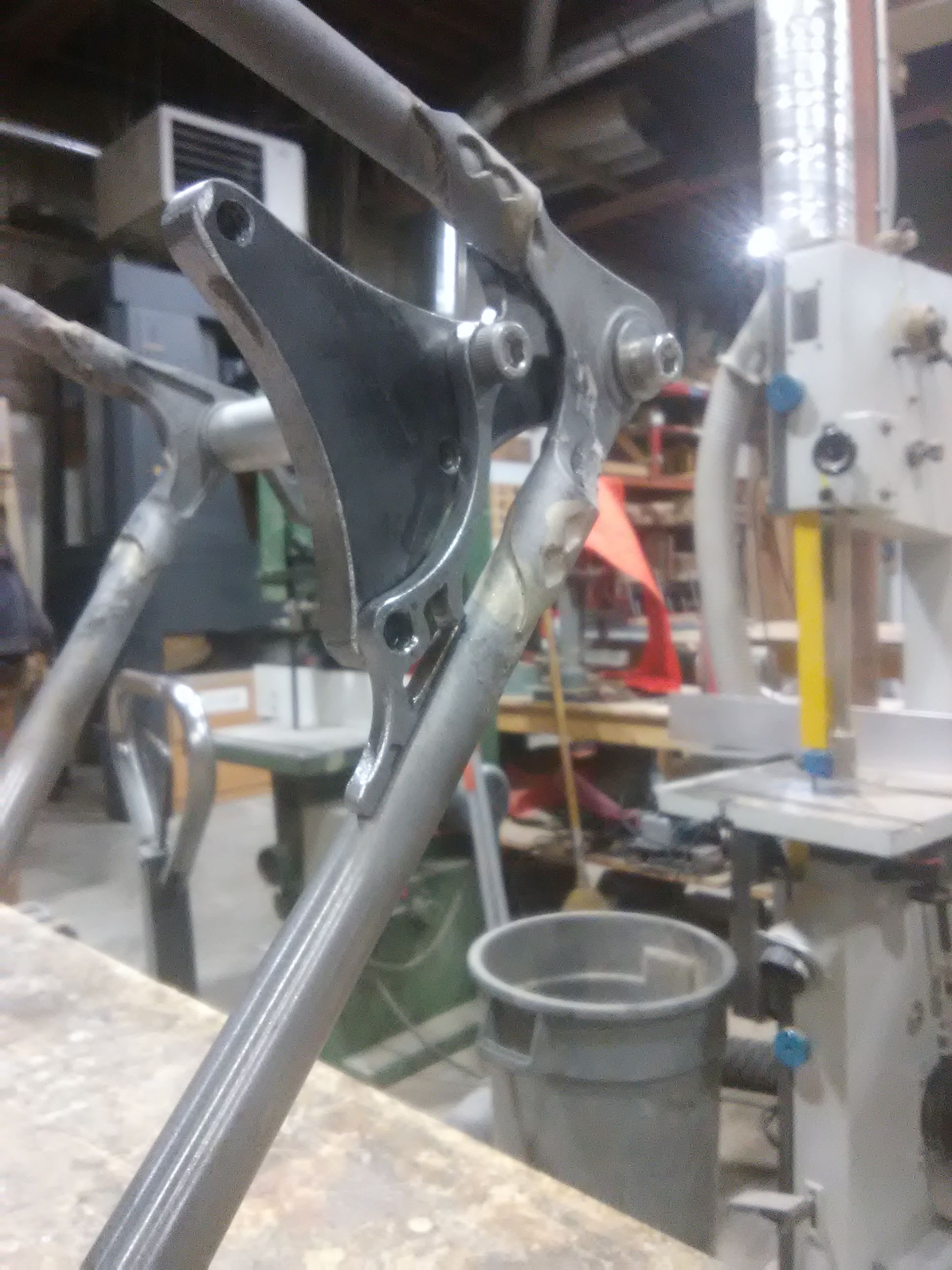 Also shown is my water cut disk brake fixture. It sits on a shoulder on the dummy axle which means it can not slide away from the dropout. I think this makes it harder to fit up the brake tab and if I were redesigning it I would allow it to slide over the dummy axle and use a set screw to hold it in place. It flips around for front and rear spacing. The front uses a couple standoffs to give proper alignment.
