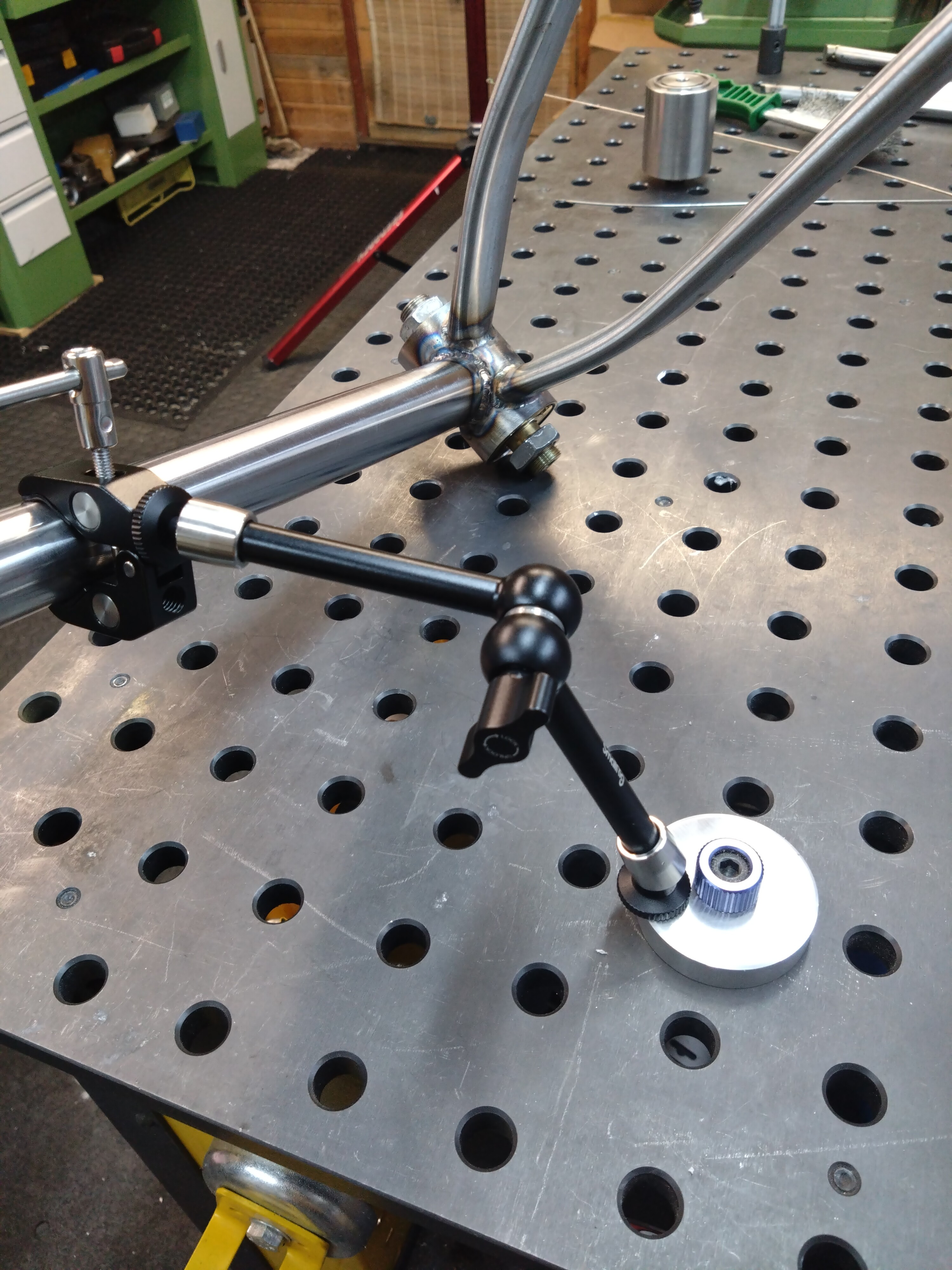Not being a great tig welder, I need all the help I can get. I talked on another thread about having dodgy vision but the other thing that I really appreciate is being in the right position. I do a lot of sub-assembly stuff on my fab table and knocked up this setup. I didn’t make the articulating arm, that’s some camera hardware, I just made a quick base to mount it to the table.