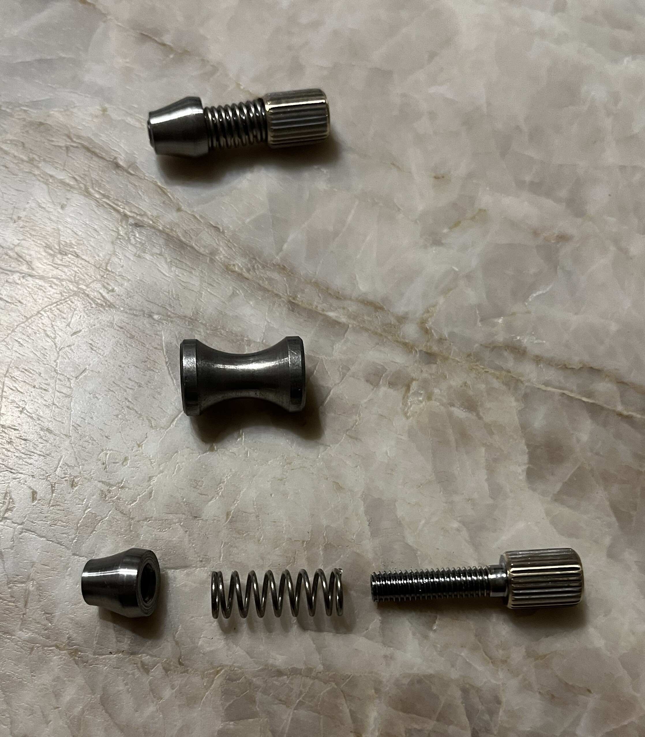 I’m cheap and have access to Jagwire parts at cost through my work. So I took a m5 rack mount that I got in a build kit almost 10 years ago and put it in my hand drill, shaped it down quite a bit with a file and some sandpaper and then cut it in half. Now I got a pair of threaded frame bosses for these jagwire barrel adjusters. I put the barrel adjusters in the drill a little bit to add a chamfer to the front and back. These’ll get mounted to the sides of the headtube on my next bike build.