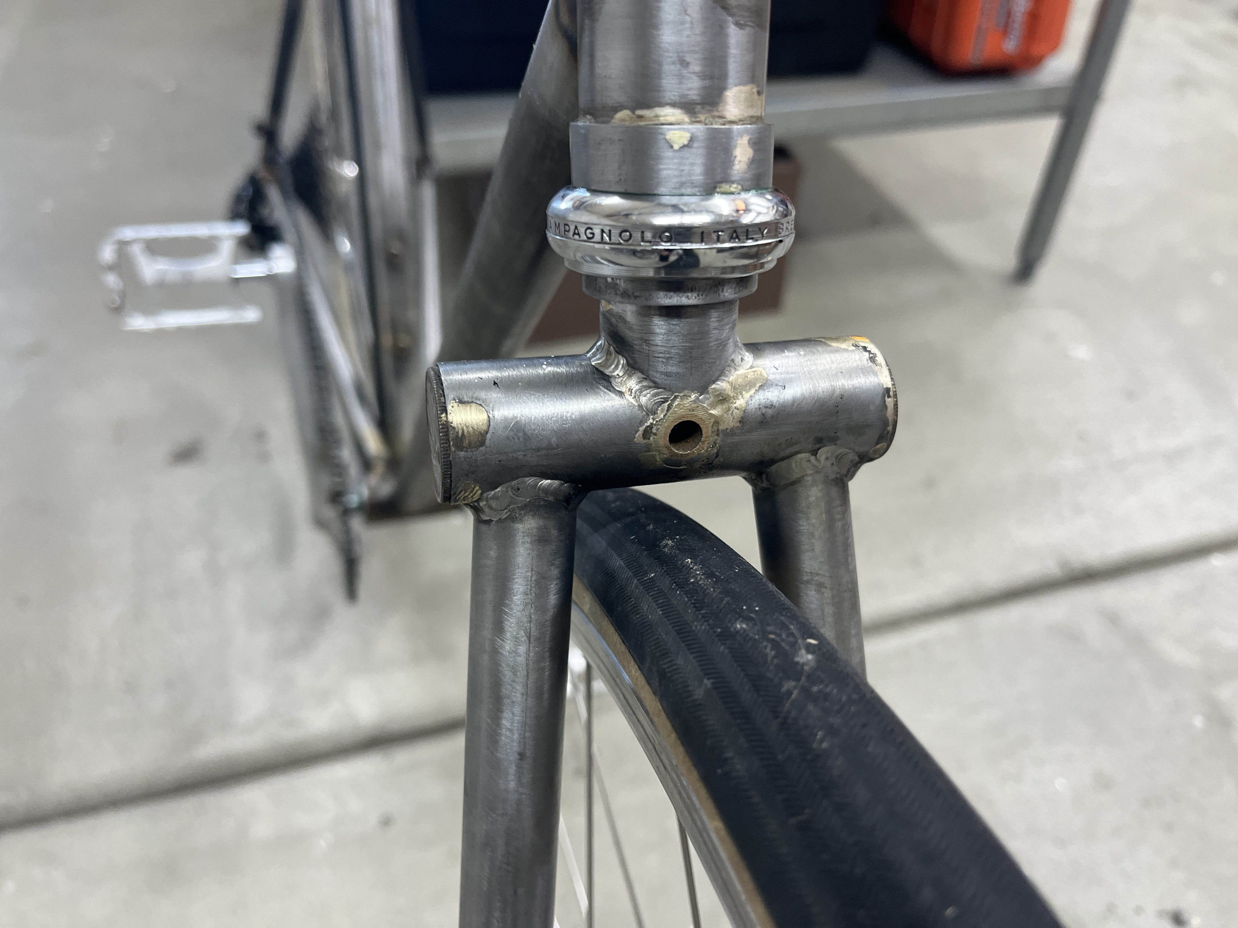 Here is my second attempt. Better than the first, but still made mistakes. First mistake is that I brazed crown seat before welding up tube node, which meant I couldn’t complete final weld for fear of undermining the braze with hot temps.