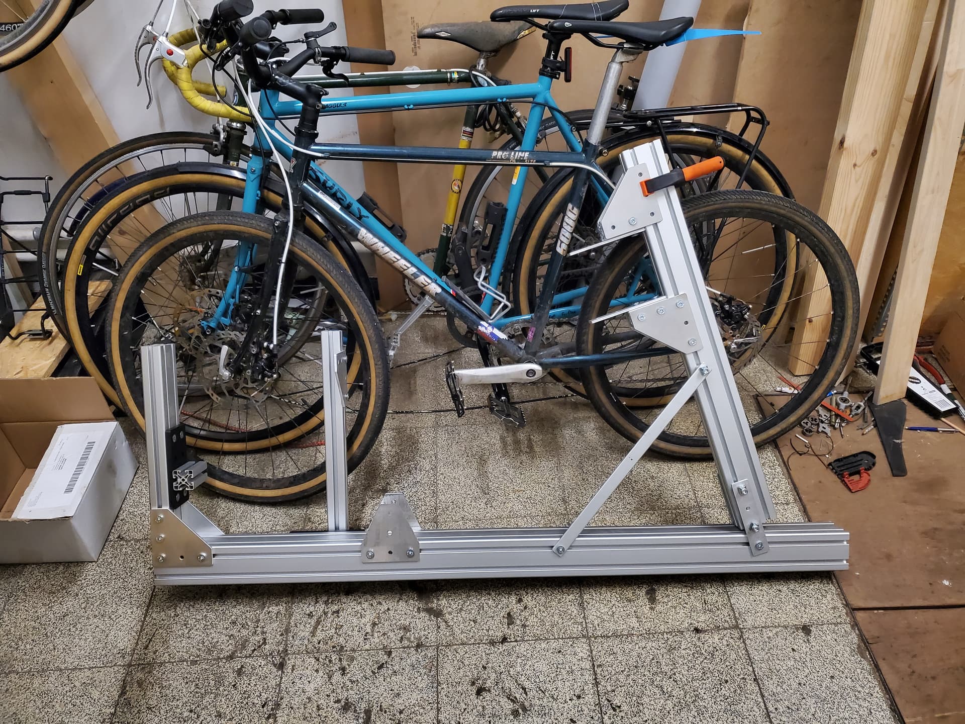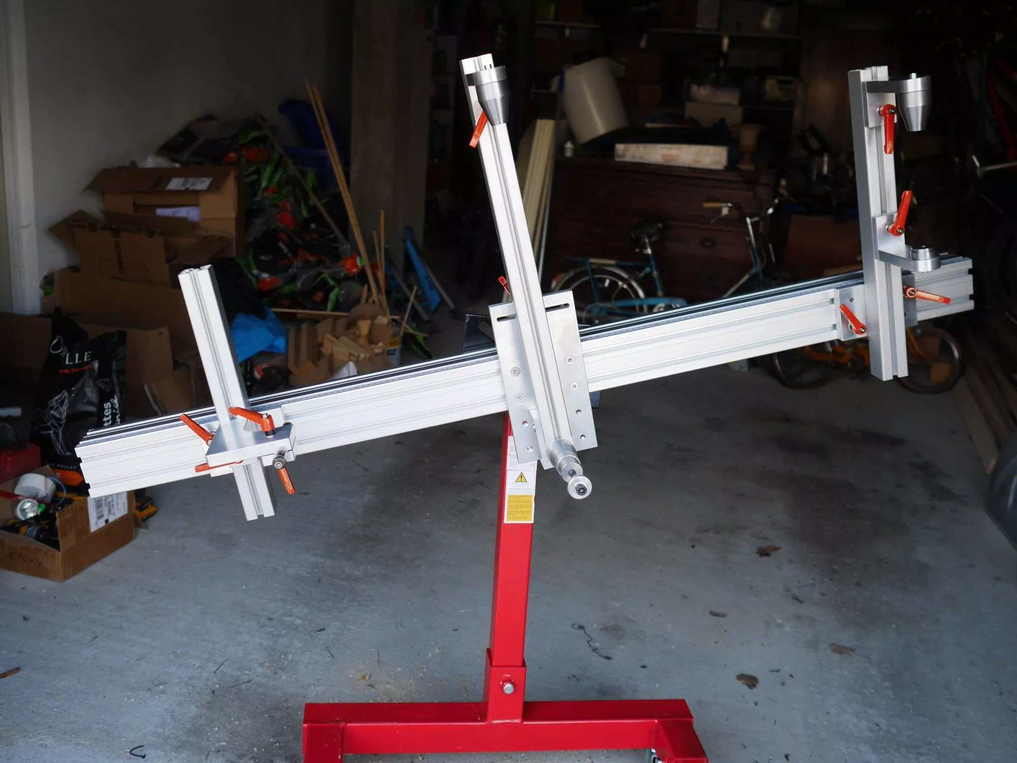 Bit altering the orientation and some parts of mine (first picture) such as slightly lighter head tube fixture with 50x50mm aluminum extrusion beam for the head tube fixture. Bicycle Frame Buddy (BFB) frame fixture source file can be downloaded at his website