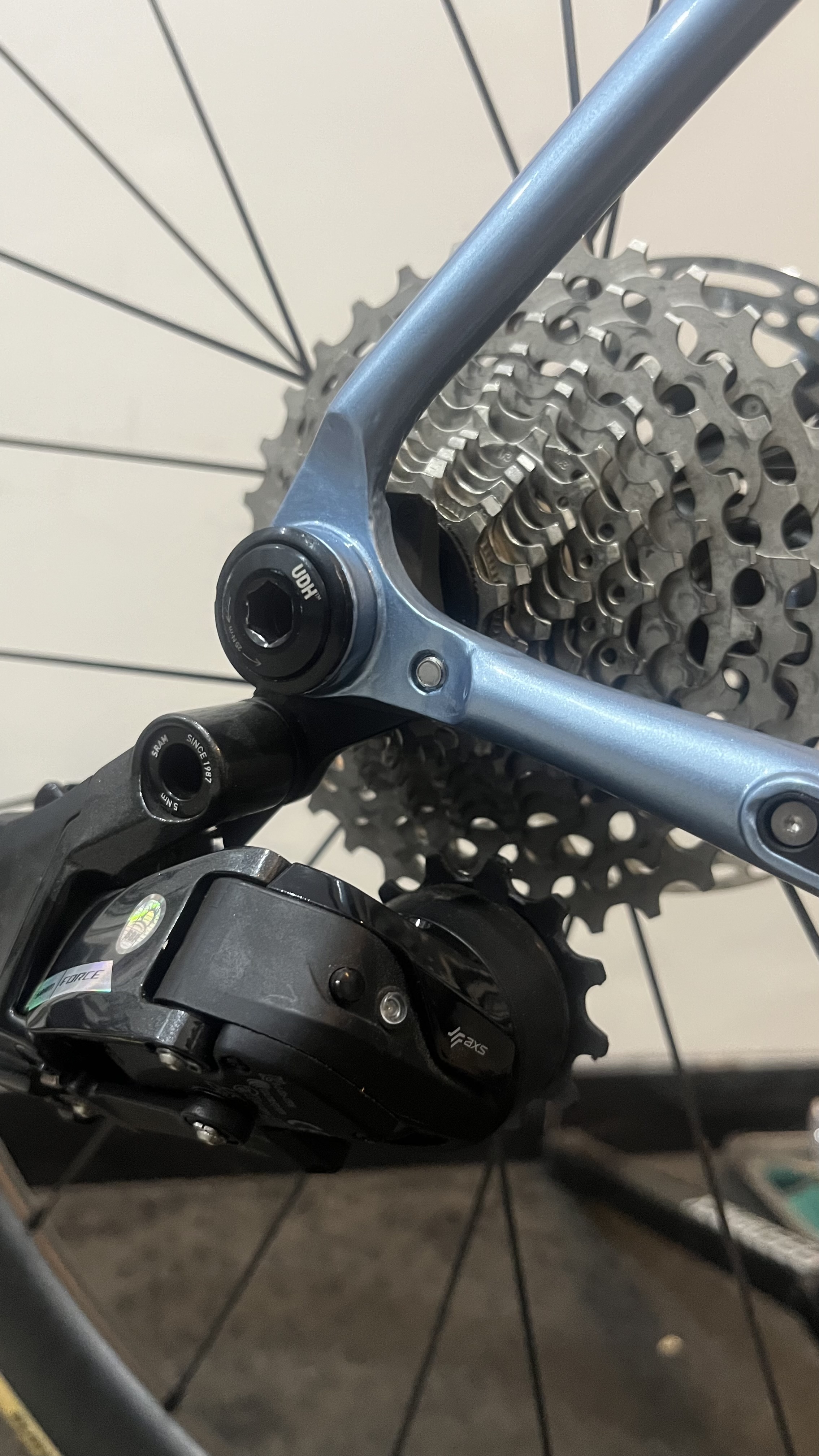 The part that engages with the thread on the axle is part of the UDH. This āBoltā for lack of a better description has a pretty coarse LH thread on the outside that holds the actual hanger on the frame, and this 12x1.0mm thread on the inside where the axle threads into.